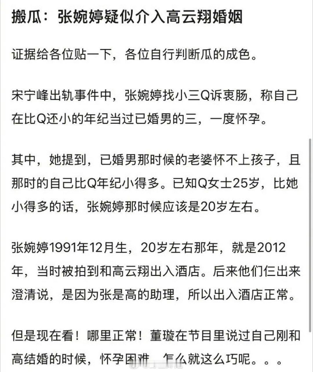 我的天啊,现在都在讨论之前高云翔跟张婉婷的事情啊,起因是张婉婷自己跟Q女士说自己也做过别人的小三,因为原配不能怀,张婉婷就怀了,刚好董璇之前也说过自己刚结婚难怀上