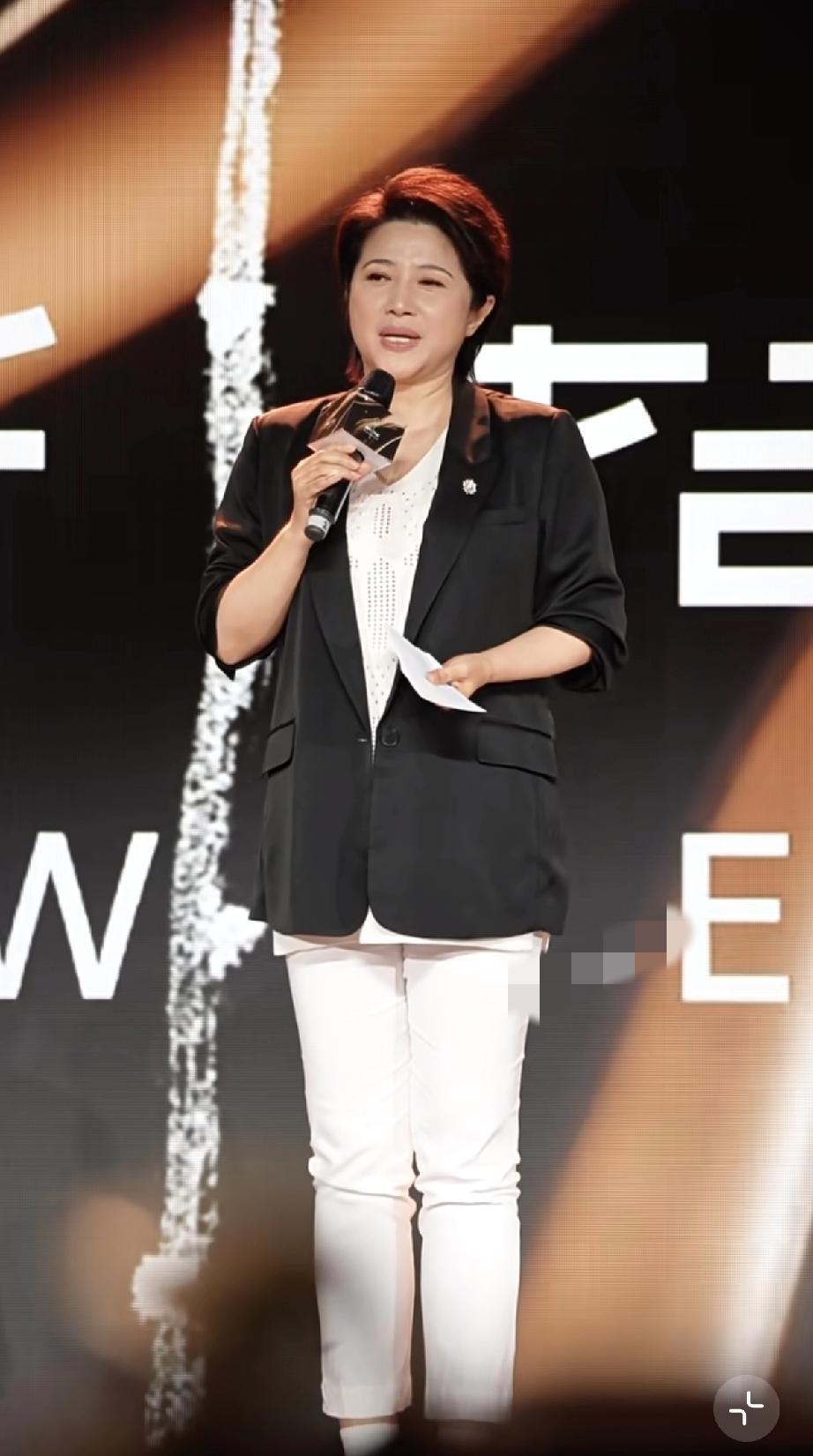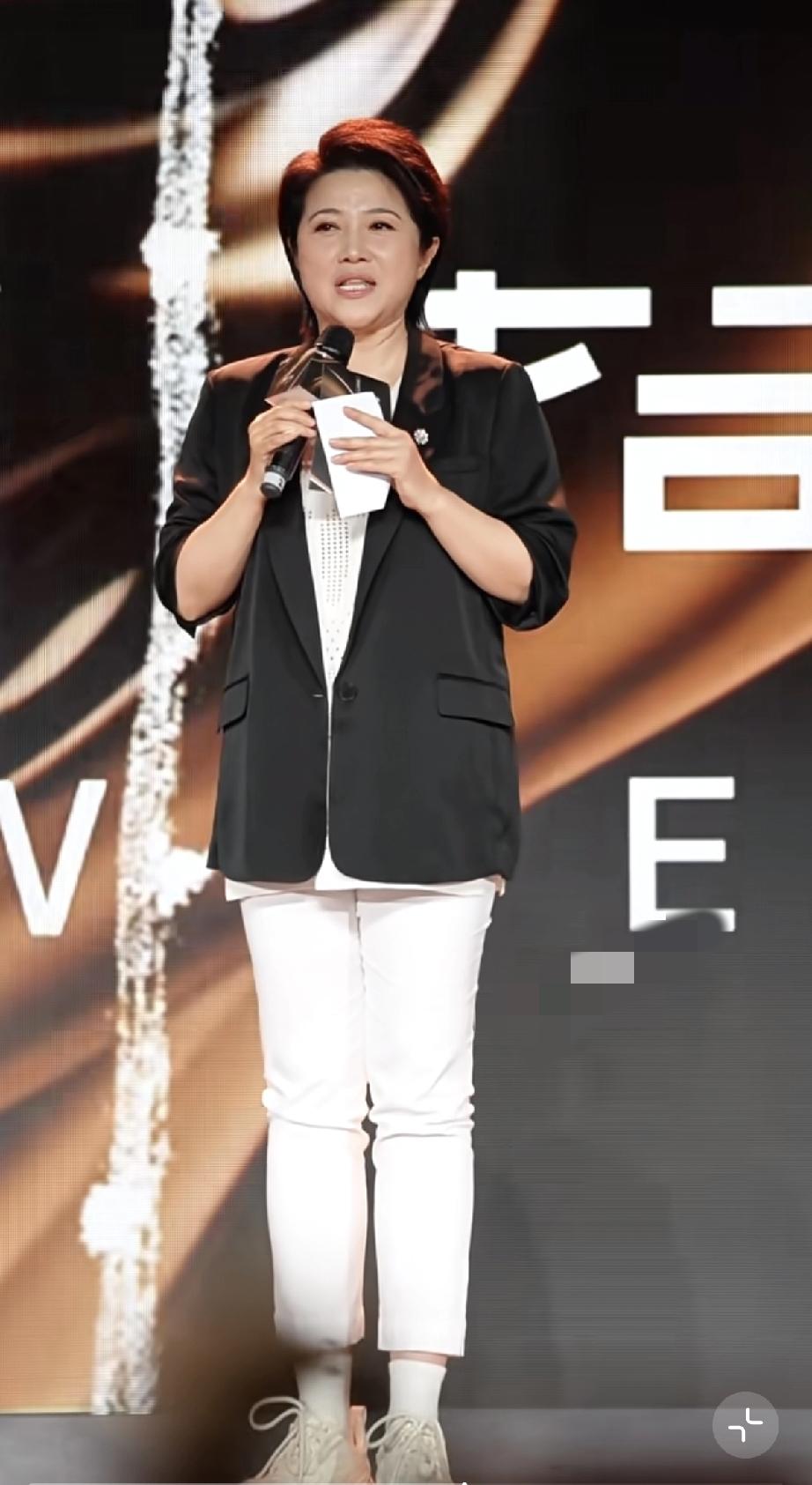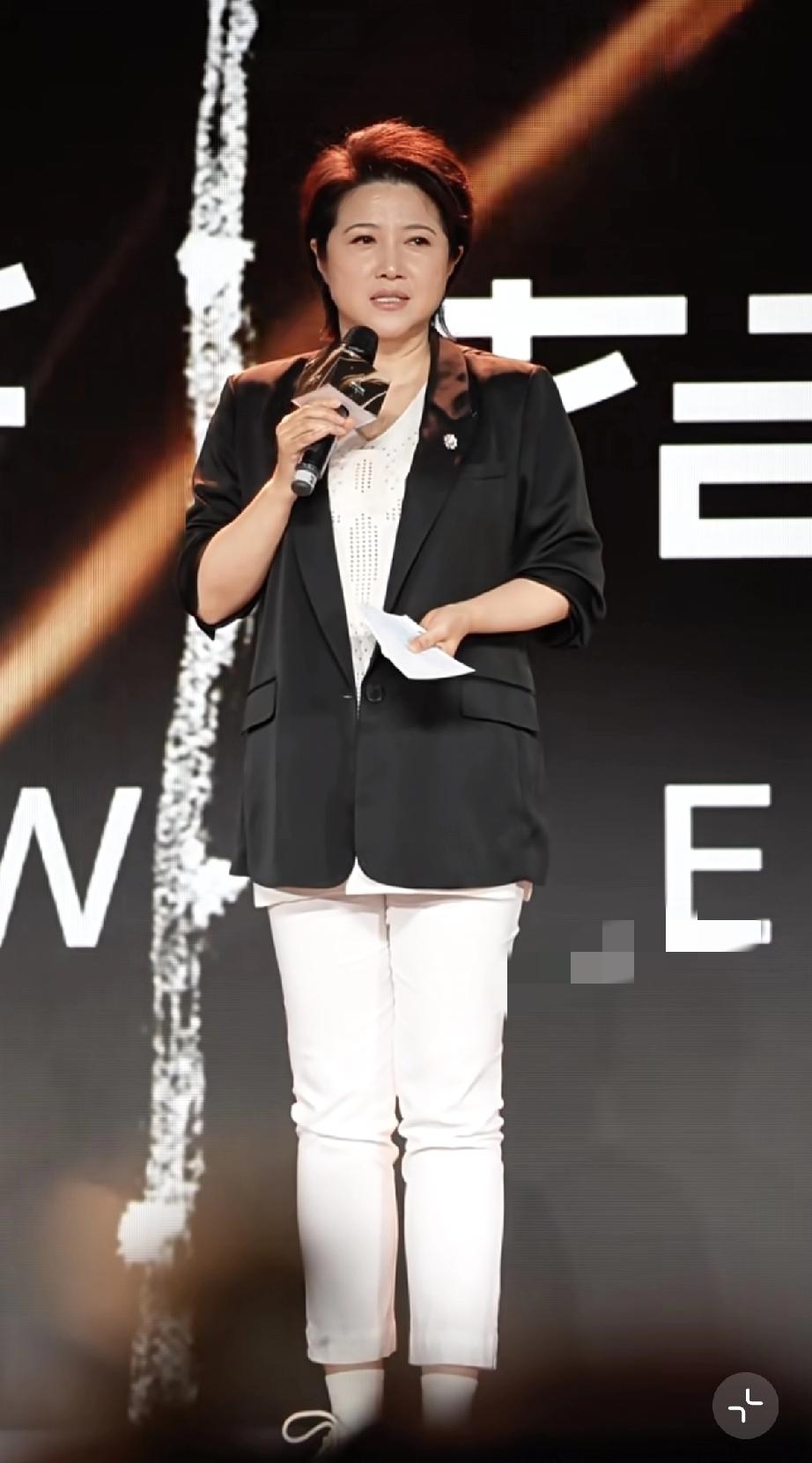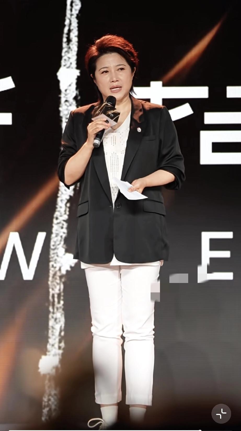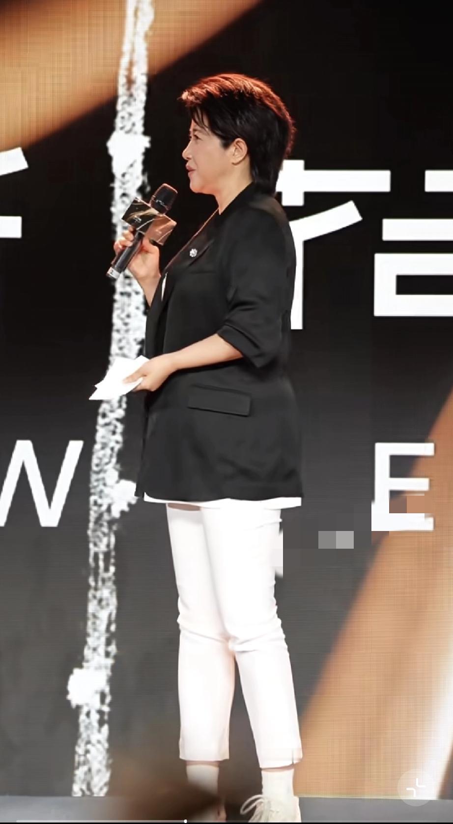 她穿了白色的裤子黑色的西服,站在台上拿着话筒讲话特别自信,一边说一边手舞足蹈,甚至还侧身,不怕别人拍到她的大肚腩。