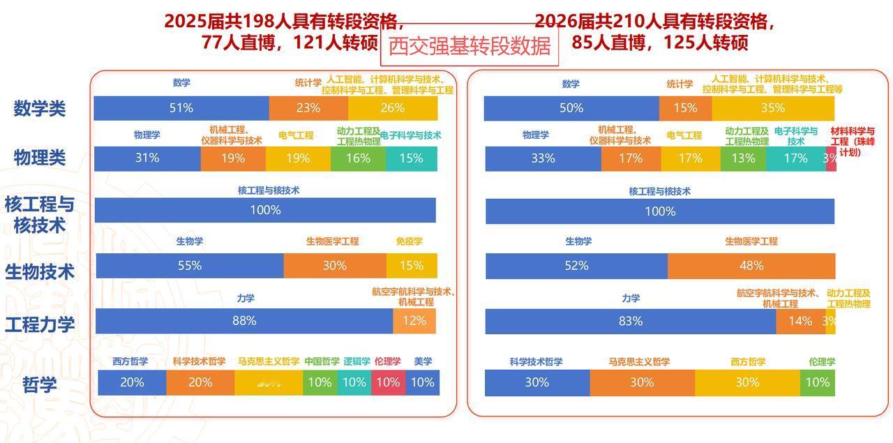 我们发现,2026届强基整体规模比2025届的转段总人数多12人,直博、转硕都略增,升学机会变多。