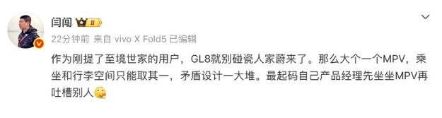不管别克是嘴犟还是引流,反正这事在车圈传开。李斌还没有回应,结果就被车圈大V直接打脸。闫闯直接发文,说自己作为别克高端MPV车主,GL8赶紧闪一边,就别来碰瓷了。这么大的MPV,做人和放行李只能二选一,设计上问题一大堆,自己先搞好再来吐槽别人!