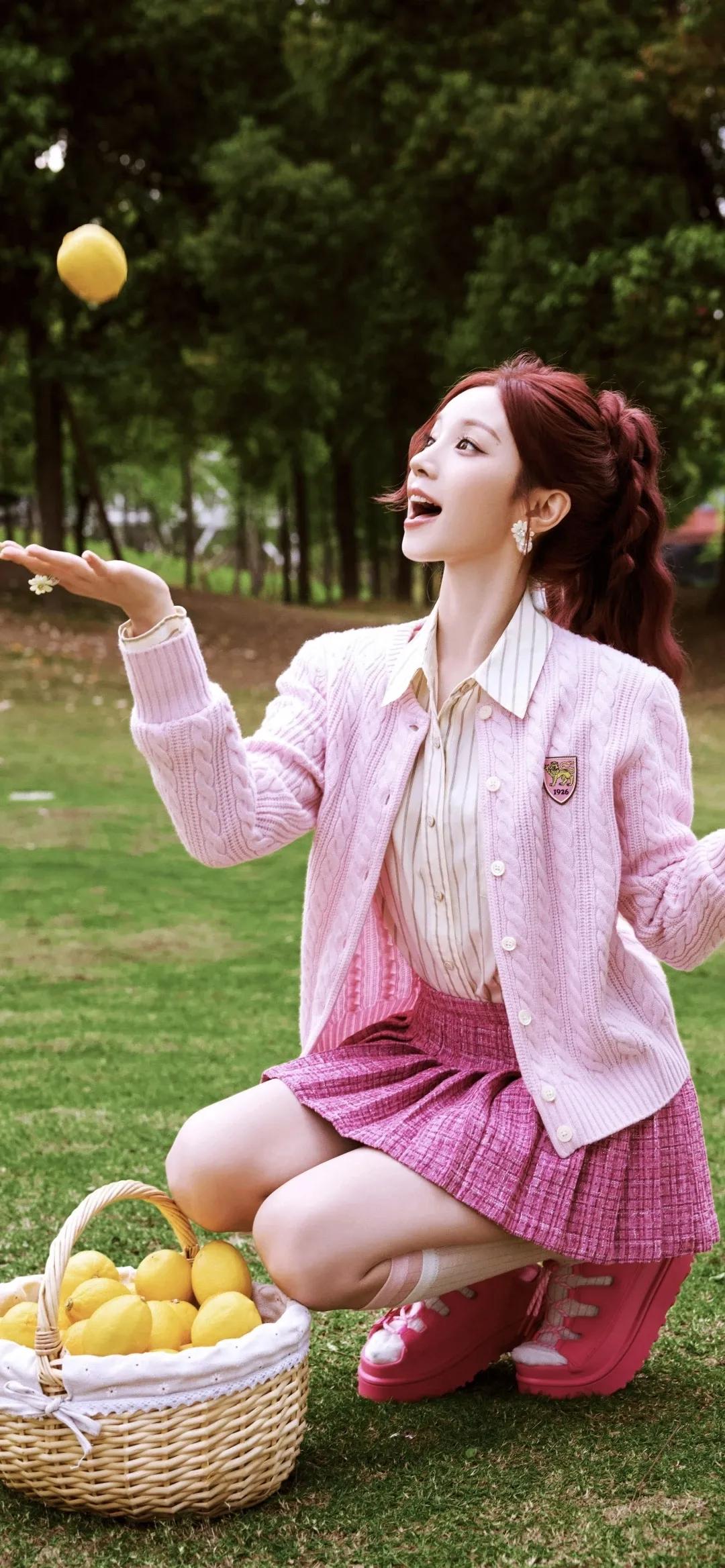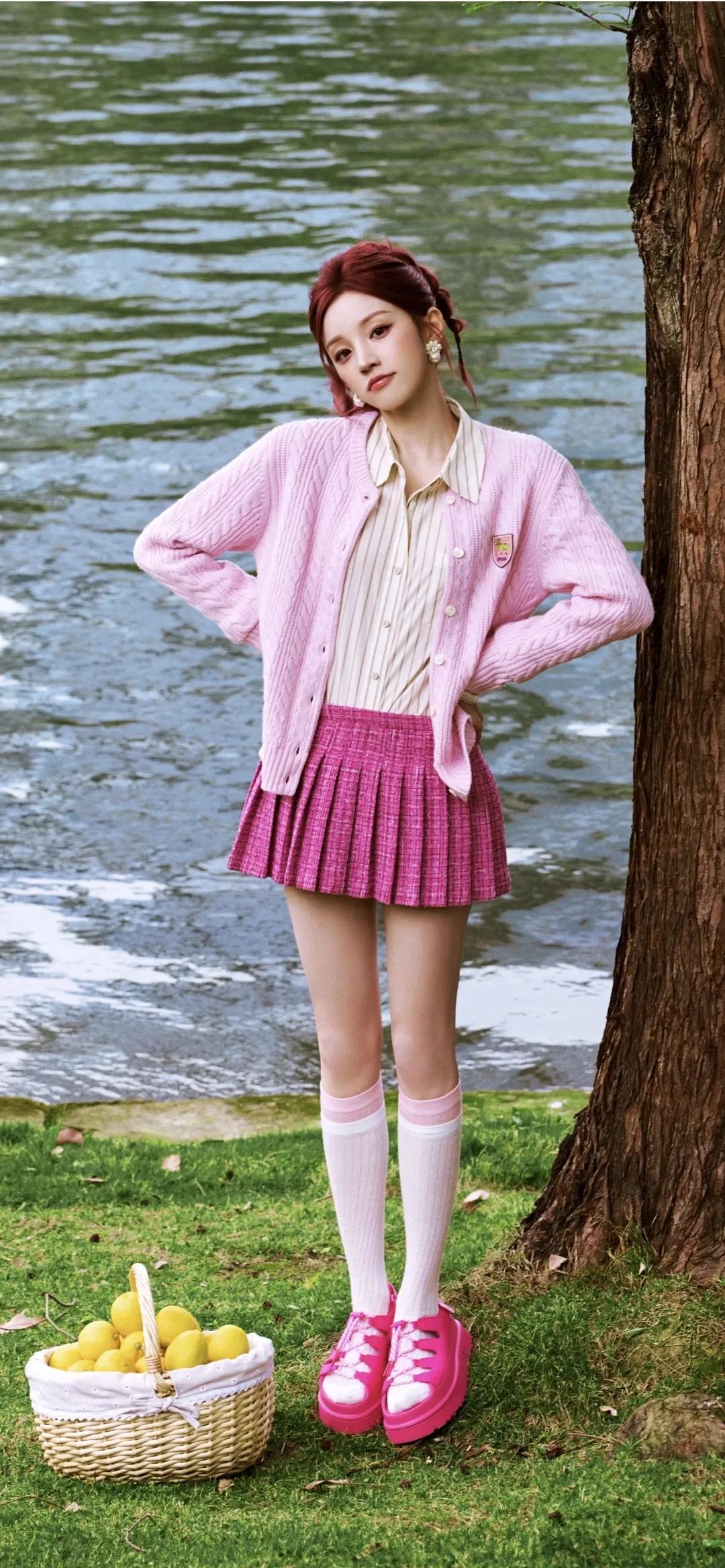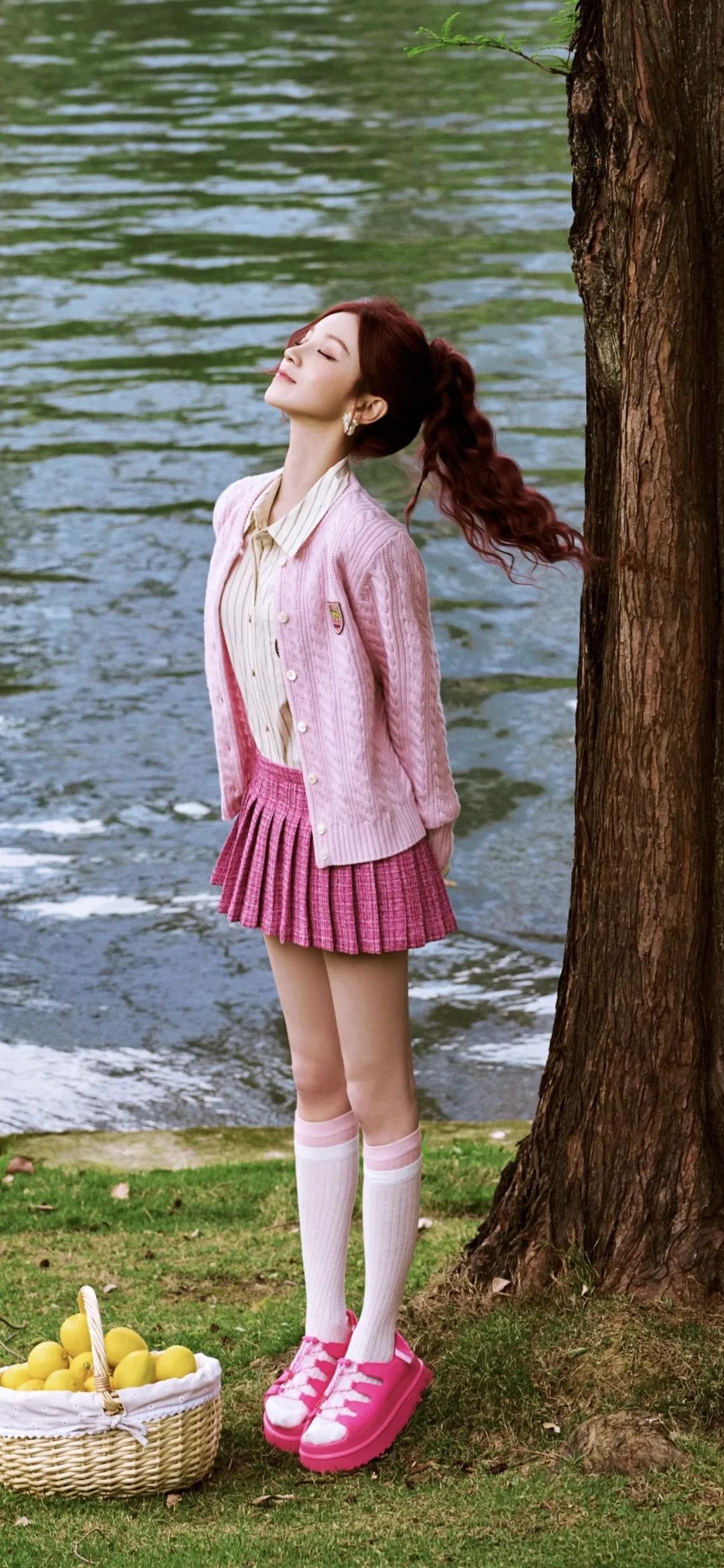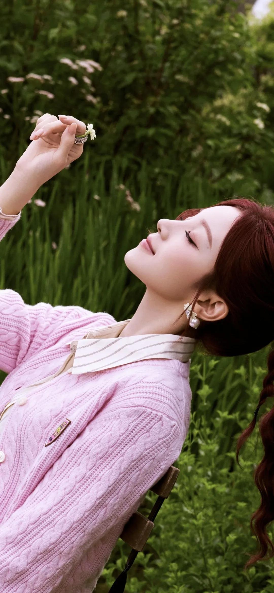 美女壁纸~宋雨琦,红棕高马尾搭配一身粉调穿搭,像闯进了春日的甜系童话。针织开衫的温柔、小香风百褶裙的俏皮,在绿意与繁花间晕染出满屏元气