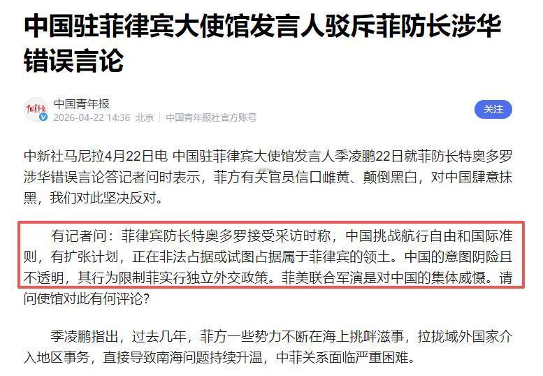 事情得从今年4月说起。菲律宾国防部长特奥多罗在接受采访时放了狠话,说中国挑战所谓的“飞行自由”,还扬言菲美联合军演是对中国的“集体威慑”。