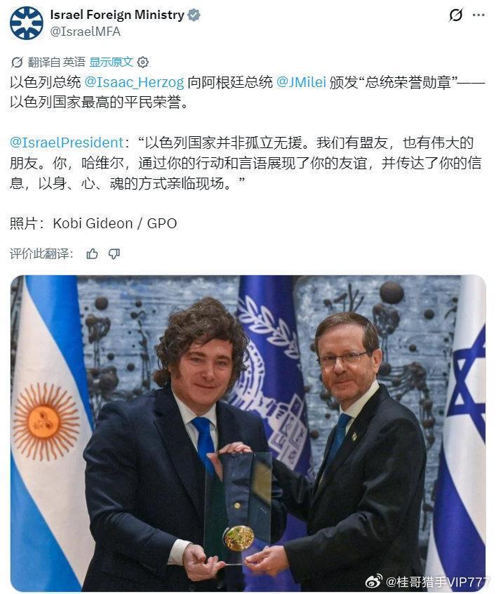 以色列向阿根廷总统米莱颁发“总统荣誉勋章”,