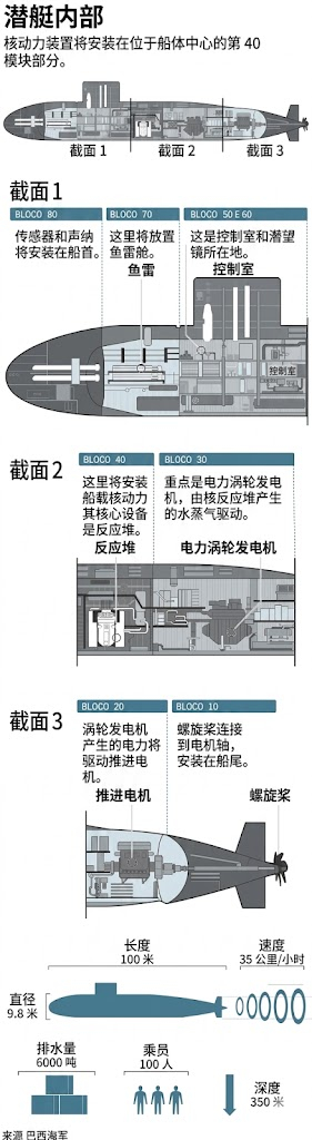 巴西海军首艘”常规武装核动力潜艇“(SCPN)”阿尔瓦罗·阿尔贝托“号(SN-10)的模型,近日,巴西海军核动力项目负责人认为巴西应该建造三艘核潜艇,而不是此前计划的一艘,旨在保持一艘潜艇部署巡逻,一艘进行维护或改装,以及一艘轮换停靠港口或进行训练,从而确保在维护周期和作战疲劳的情况下,舰队仍能持续可用。军事ai新视野ai热力追踪 【图2】由AI生成目前,巴西核潜艇一再延误。最初设定2024年完工,先是推迟到2033年,随后又推迟到2037年,累计延误超过十年。自2008年该项目已投入约400亿雷亚尔(约合76亿至78亿美元),用于基础设施建设、技术转让和常规潜艇建造。然而,资金缺口导致项目进度多次调整。目前的计划显示,反应堆原型测试正在进行中,预计在反应堆验证完成后将推进艇体建造,并计划于2037年下水。巴西海军表示暂无取消项目的预期,但也承认持续不稳定的资金状况将进一步延长项目工期。巴西在2026年申请的10亿雷亚尔(约合1.9亿美元)预算旨在稳定项目进度,防止进一步延误。