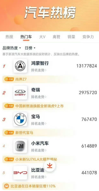 昨日汽车热榜更新,鸿蒙智行和尚界Z7直接断层碾压!鸿蒙智行热度领先第二名1100多万,尚界Z7领先第二名400多万,一骑绝尘。