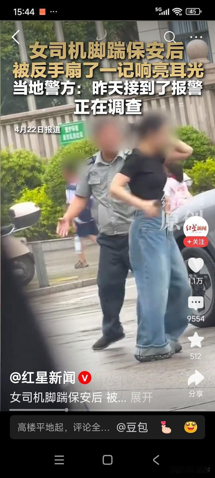 随后,有人将完整版视频发到网上,原来保安先辱骂女子,还用车门夹她的腿,女子下车后才踹了保安一脚,接着保安狠狠打了女子一巴掌,那一下用尽了全身力气。