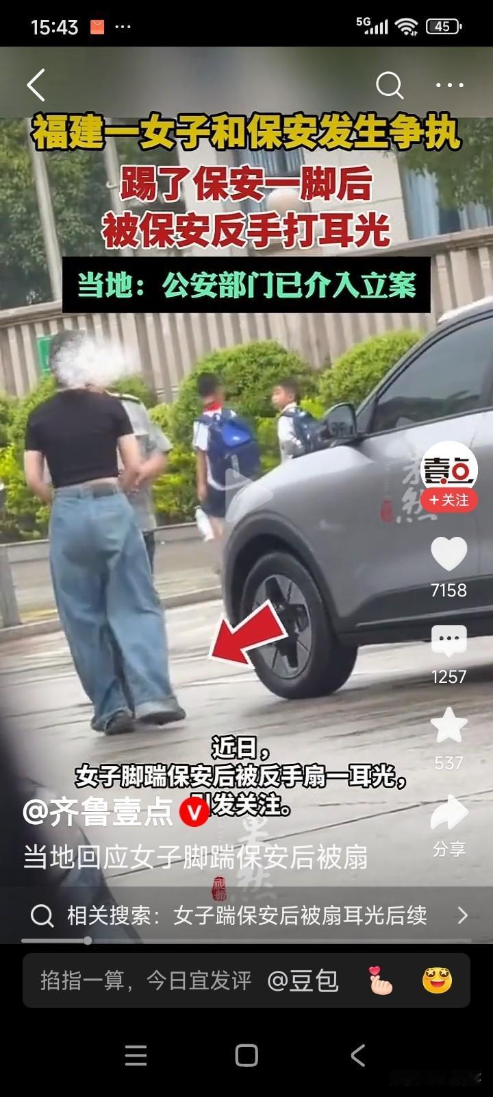 女子怒火中烧,下车后朝保安踹了一脚。保安毫不示弱,反手就是一巴掌。