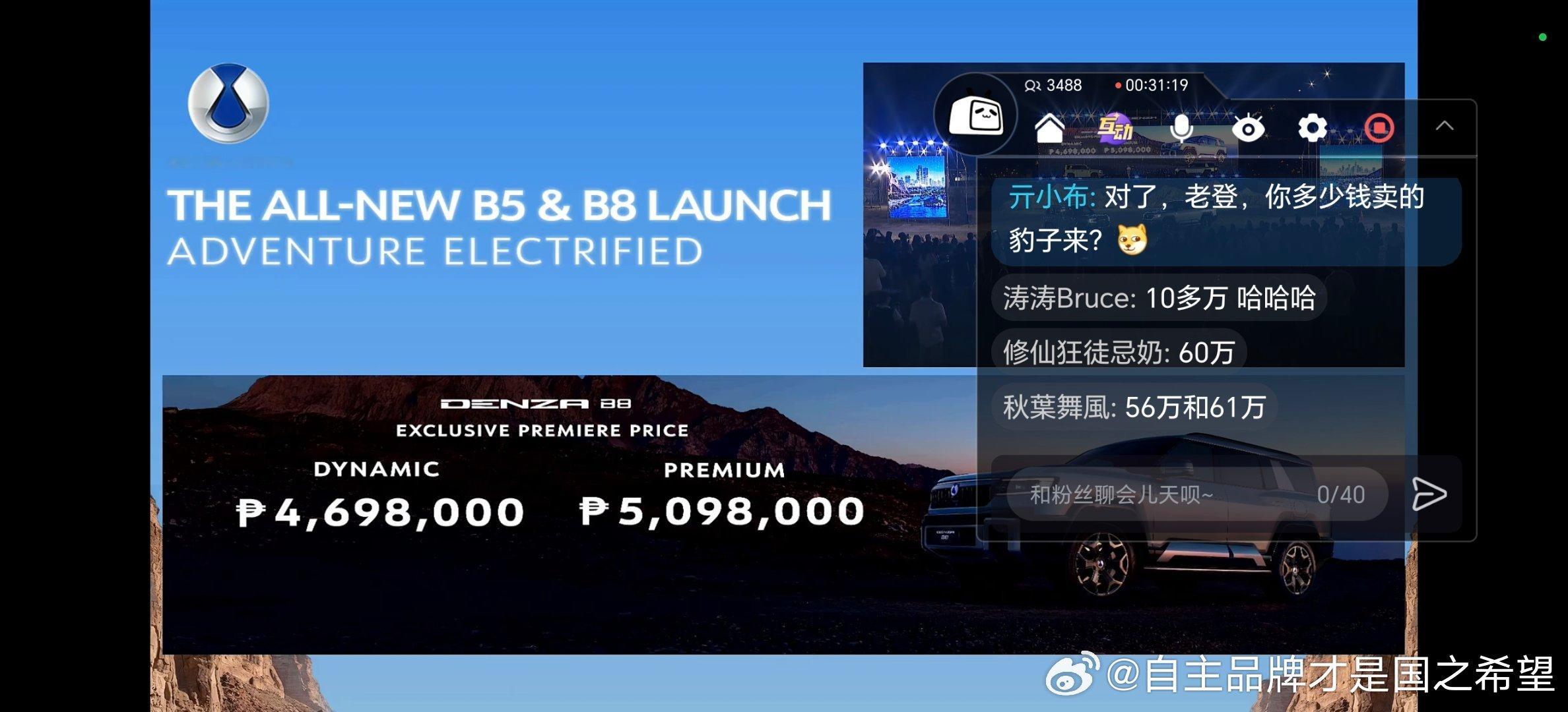 刚看完denza b5 b8在菲律宾的发布会当地建了一个腾势竞技场大概是个越野的小场地,供车主玩乐。在竞技场里交付首批豹5豹8(海外叫腾势b5b8)价格40-60万人民币 菲律宾已经有了四个腾势授权经销商。