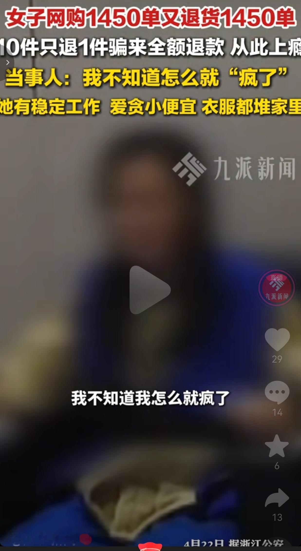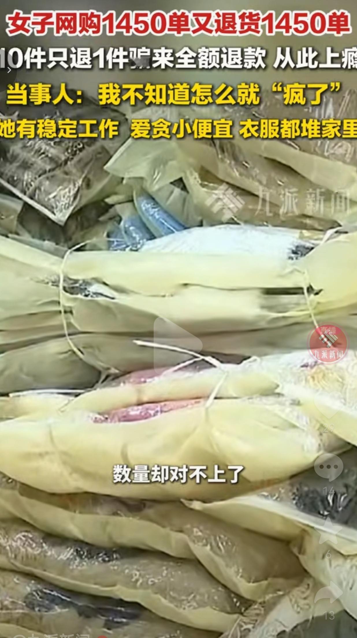 她前后在一家店下了1450单,又全退了1450单,退一次拿一次全额退款,家里堆得跟小山似的衣服,全是这么骗来的。