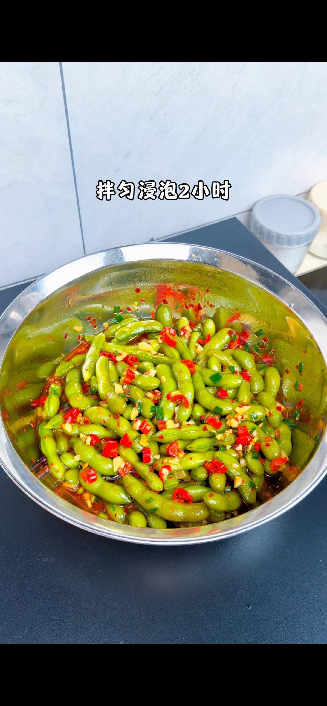 2️⃣把料汁倒入毛豆中,拌匀后浸泡2小时,让每颗毛豆都吸饱汤汁,这样做出来开胃爽口、香辣入味,好吃到停不下来!