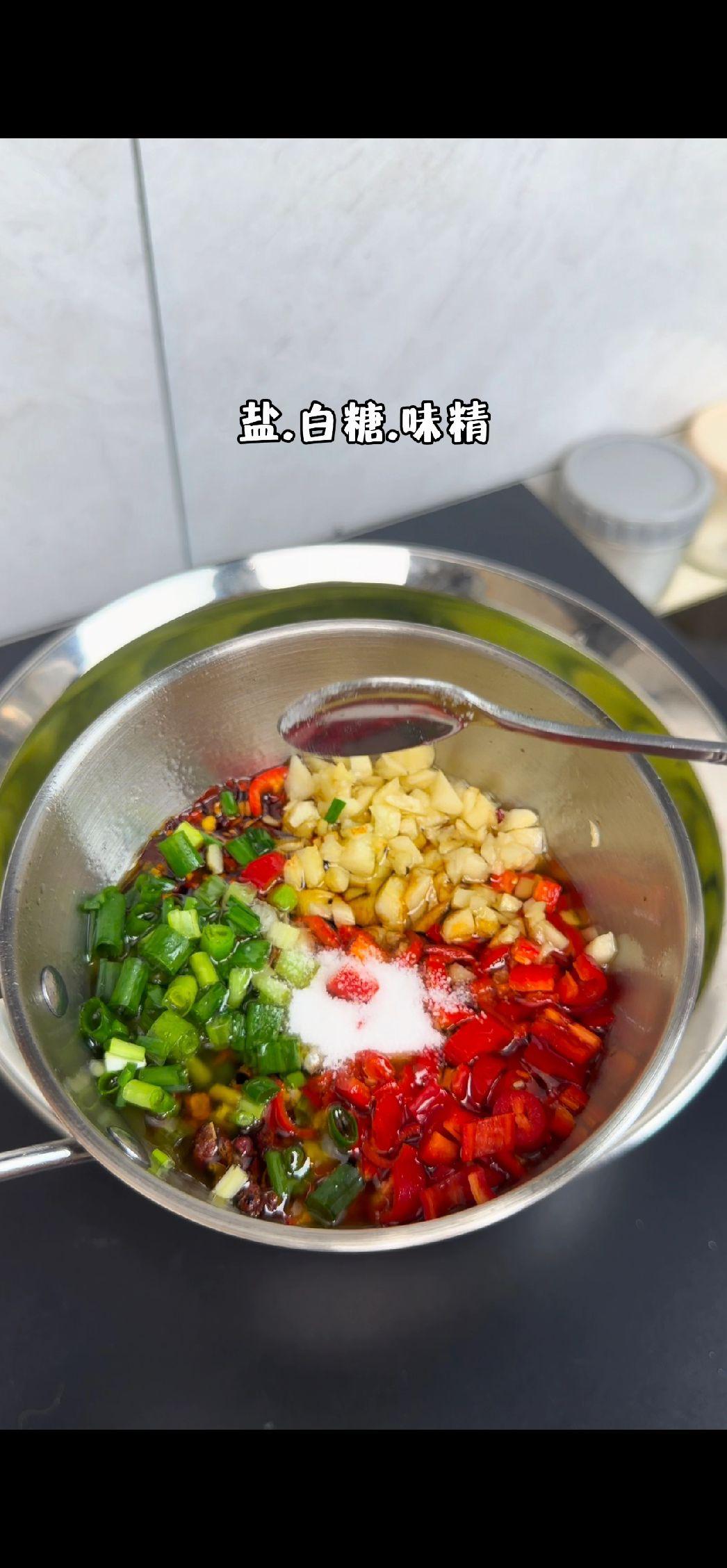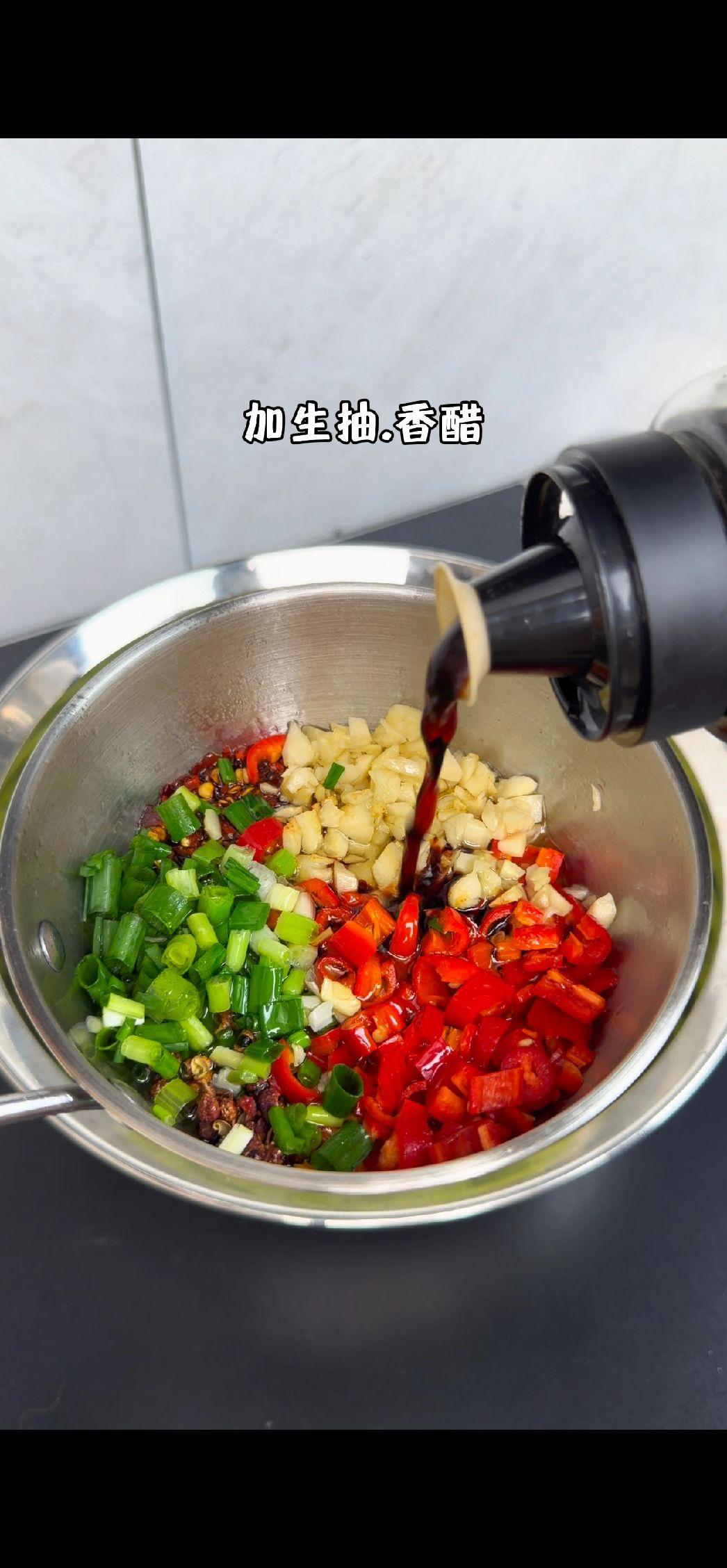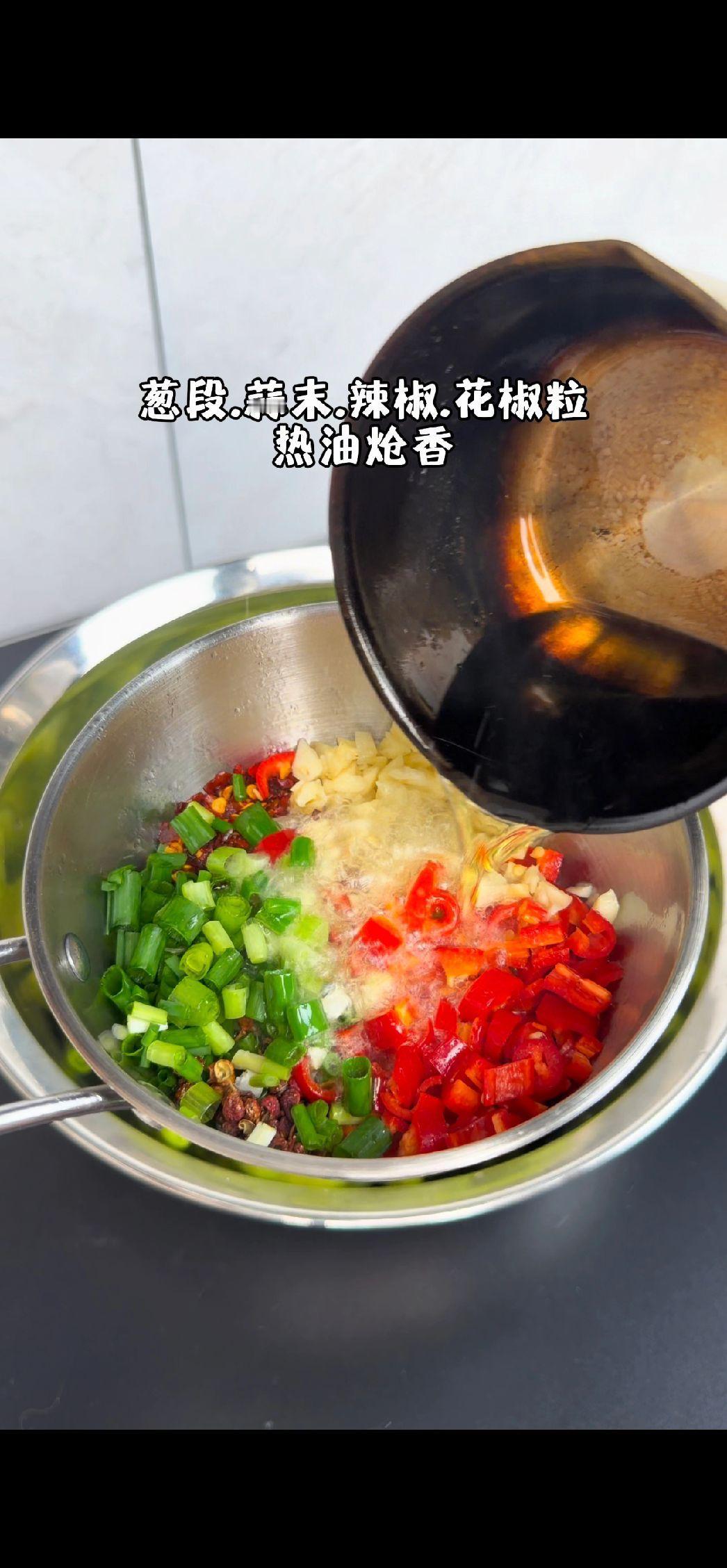 1️⃣准备灵魂调料:葱段、蒜末、辣椒、花椒粒热油炝香,加生抽、香醋、盐、白糖、味精搅匀,再倒半碗清水调成料汁。