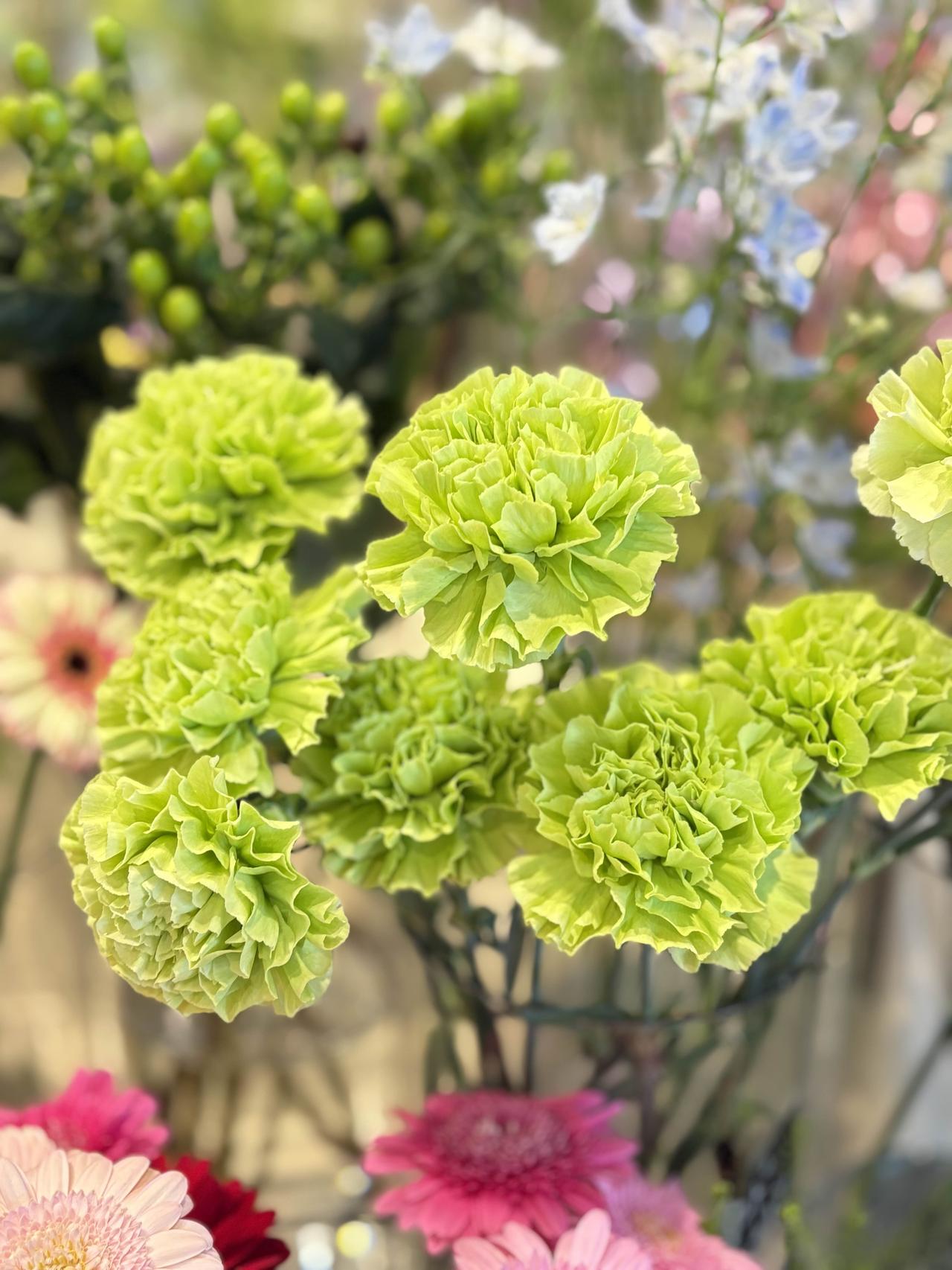 2. 康乃馨 ,浅绿色的康乃馨,常被称为“绿精灵”。