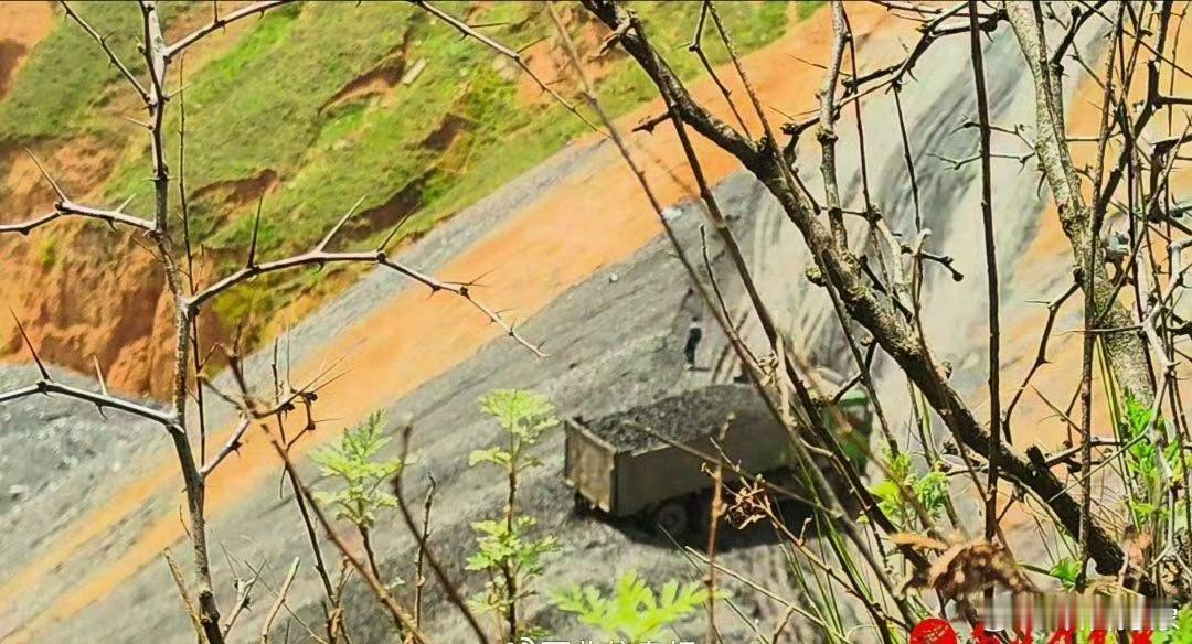 满载废弃煤矸石的车辆进入倾倒点,戳下图