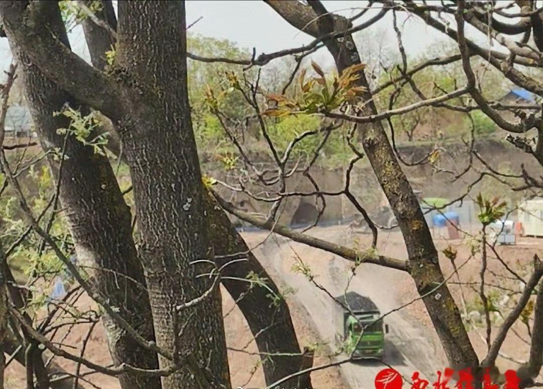 香花沟(现并入小章村)位于彬州市新民镇。记者在现场看到,沟壑内堆放了大量黑灰色煤矸石,层层堆叠。沟底未见明显的防渗处理,裸露的煤矸石未做覆盖。进出工地的运输车辆扬起大量尘土,现场未见浇淋防尘设施启用。