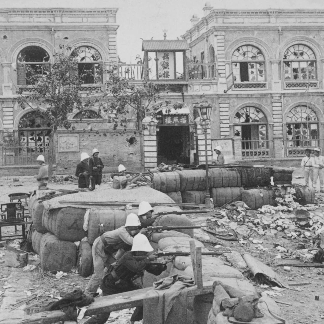 1900年,法国军队攻占天津时,在街边用麻袋堆起防御工事,全员持枪据守、枪口朝外