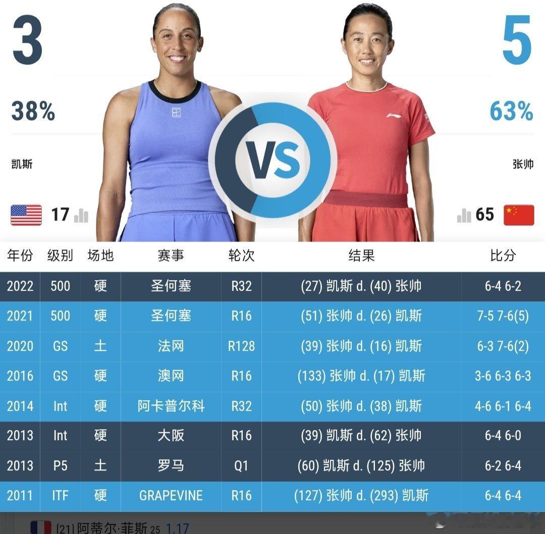 17:00左右 WTA1000马德里站女单第2轮张帅🇨🇳 vs 凯斯🇺🇸