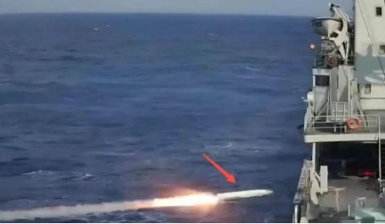 导弹冲破海面时带着白色水雾,拖着橘红色尾焰直冲天际,随后调整姿态,贴着浪尖掠海飞行,最后精准撞上靶舰。