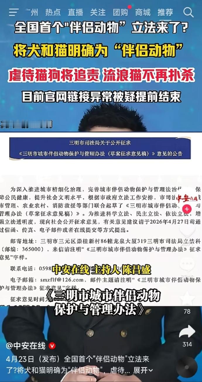 全国首个伴侣动物立法草案被删除 三明搞的这个伴侣动物保护法,为什么会草草下线?因