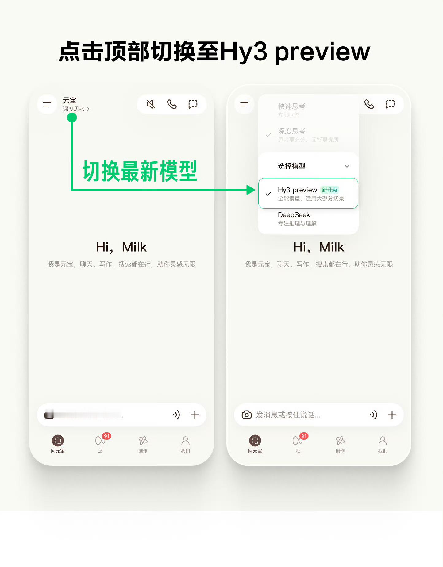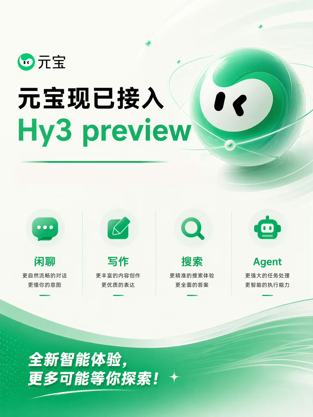 腾讯发布Hy3preview大模型 今天,元宝全面接入了 Hy3 preview!做到了