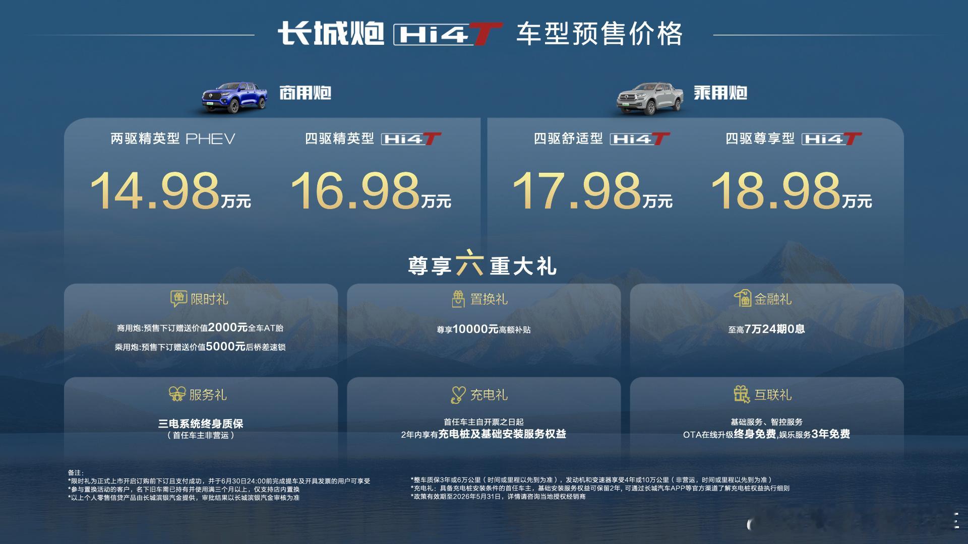 商用炮两驱精英型PHEV预售价14.98万,四驱精英型Hi4-T预售价16.98万;乘用炮四驱舒适型预售价17.98万,四驱尊享版预售价18.98万。现在订车送一万置换补贴、至高7万2年0息、三电终身质保。商用炮限时赠送AT胎,乘用炮赠送后桥差速锁。