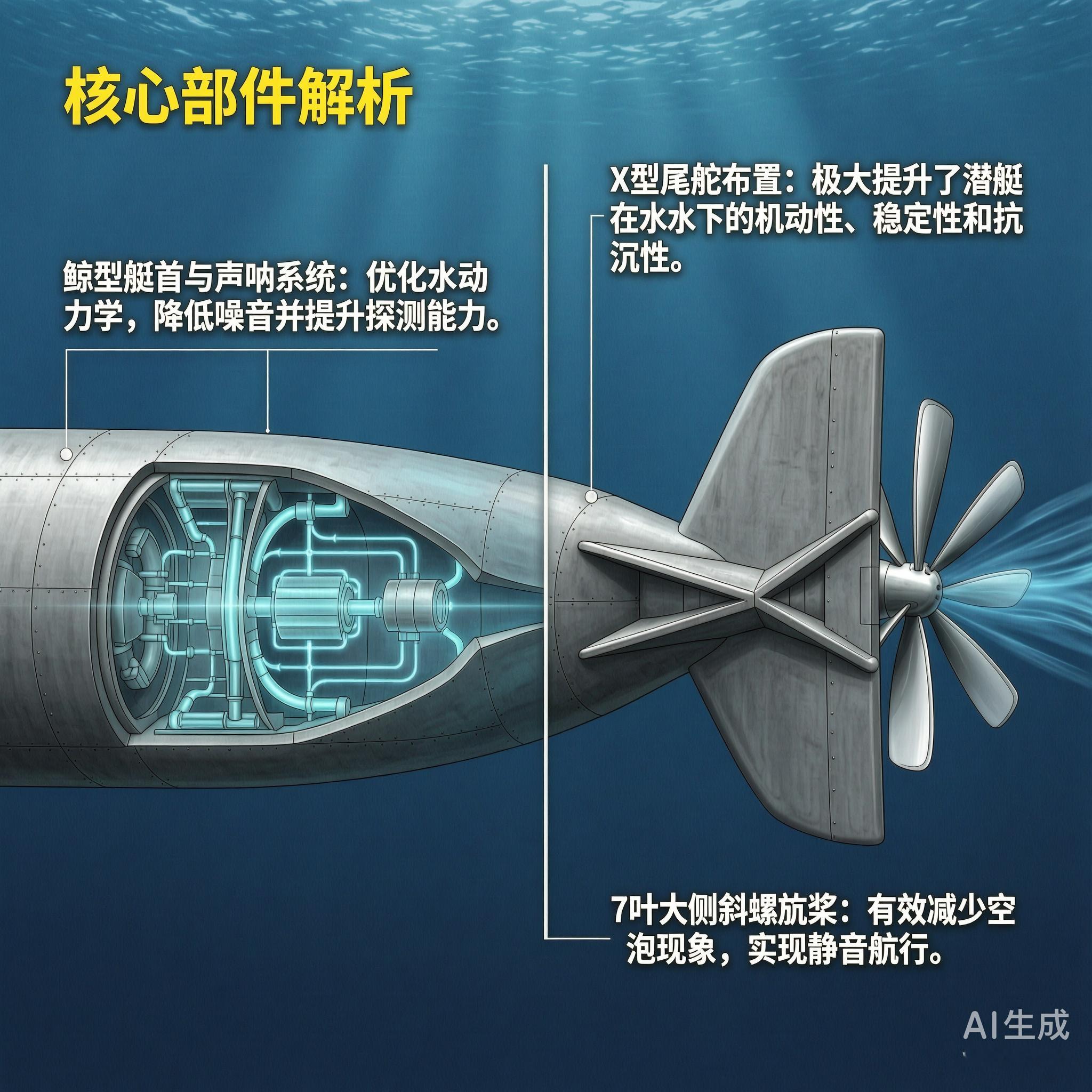 “海象”级潜艇为鲸型艇首、回转体尖尾艇型,它的艇尾控制板采用X型布置,这样提高了潜艇在水下航行时的机动性和抗沉性,并改由计算机控制。该艇采用的螺旋桨为7叶大侧斜螺旋桨,艇体采用HY-100钢制造而成。“海象”级潜艇在9节的航速下,续航能力高达10000海里,能够持续在海上执行任务60天。