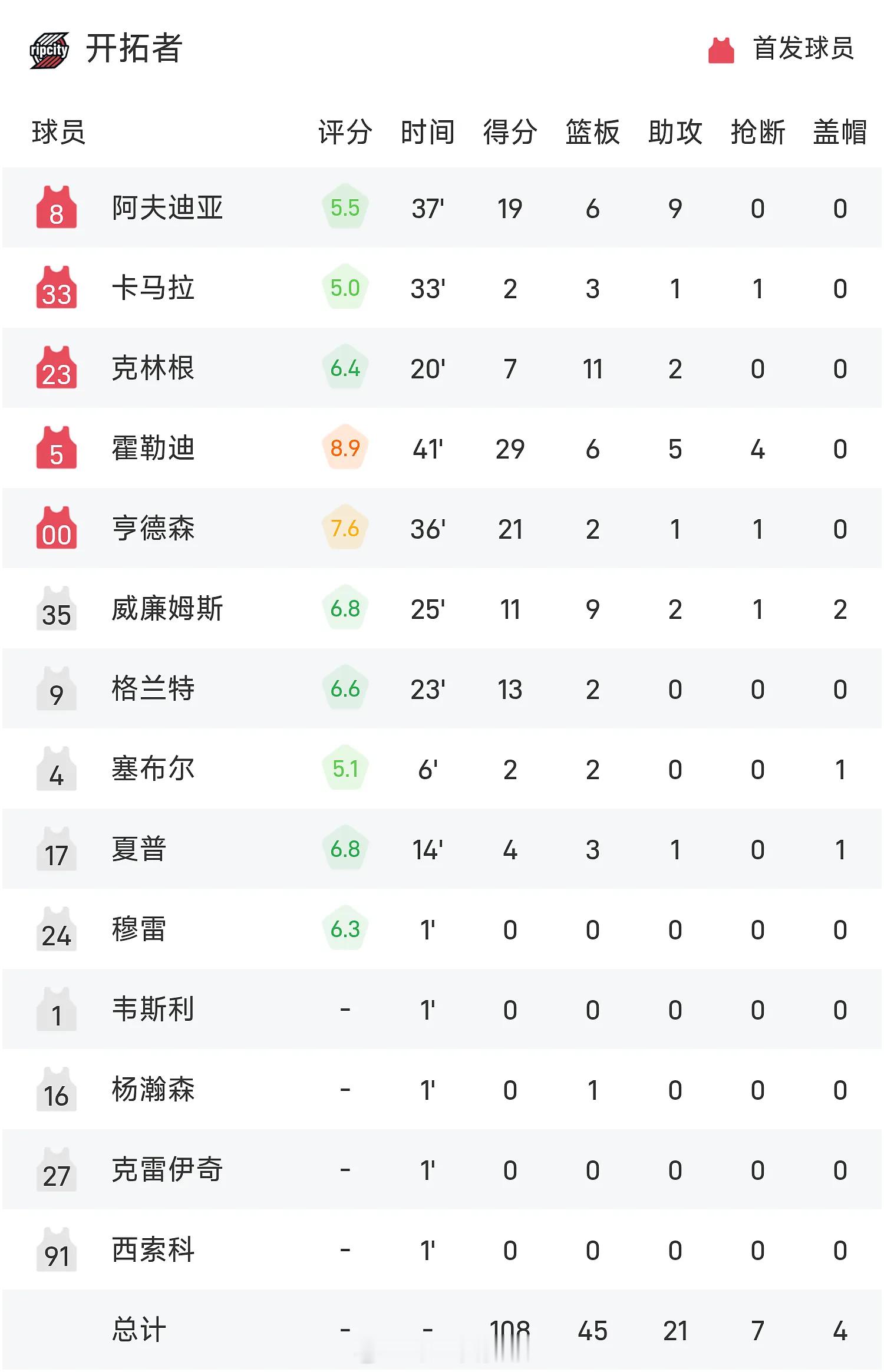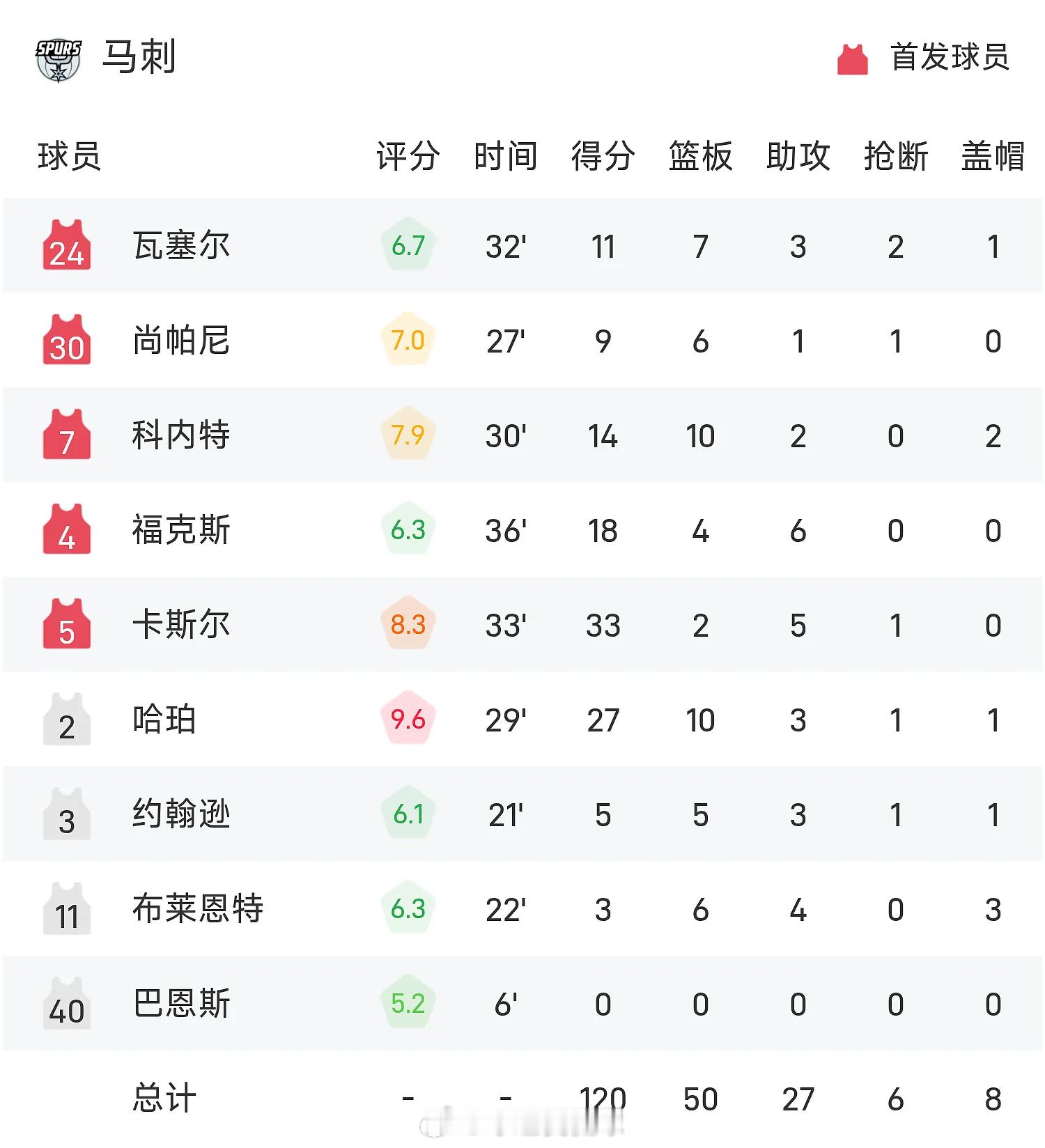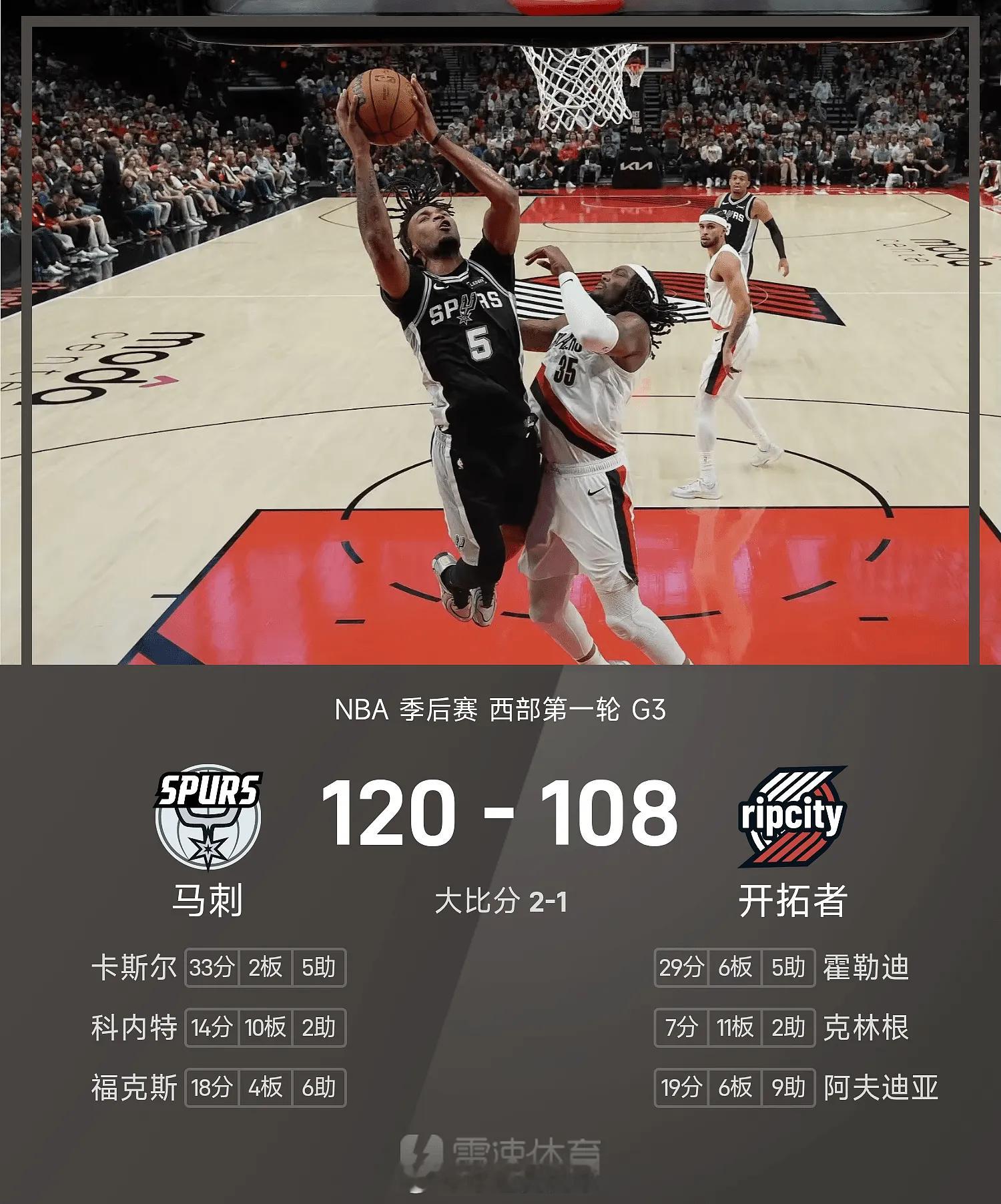 04月25日讯 25/26赛季NBA 季后赛 西部第一轮,开拓者对阵马刺。双方全场战罢,开拓者108-120不敌马刺。卡斯尔砍下全场最高的33分2板5助,率领马刺成功取胜,哈珀替补拿下27分,为科比后最年轻季后赛替补拿下20+得分的球员,马刺完成15分大逆转,大比分2-1领先开拓者。NBANBA体育明星开拓者vs马刺nba