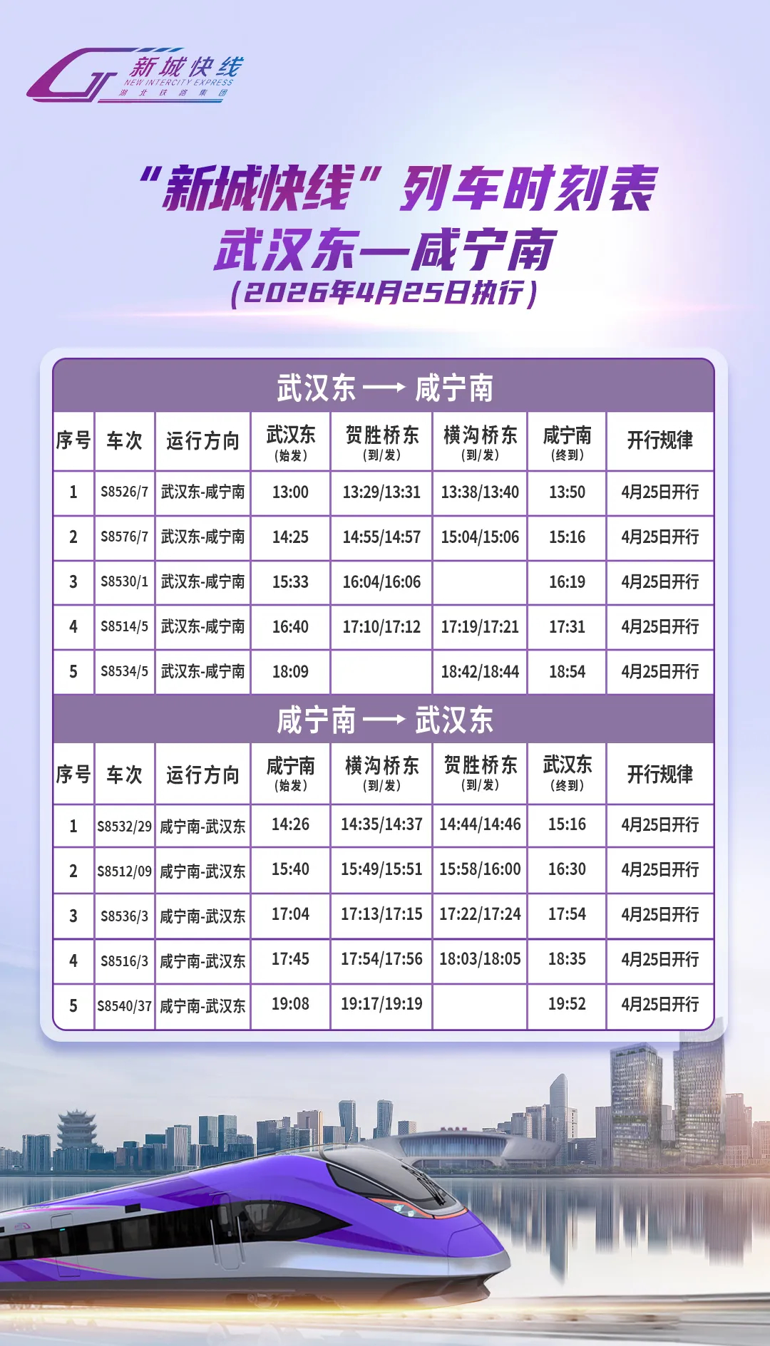 通行线·铁路【开通13年后公交化运营,武咸城际迎来新城快线】历时半年多改造,今(4月25日)起,武汉至咸宁城际铁路公交化 “新城快线”开通运营。这是继武汉至黄石、武汉至黄冈后,武汉都市圈开通的第三条公交化运行的“新城快线”线路。