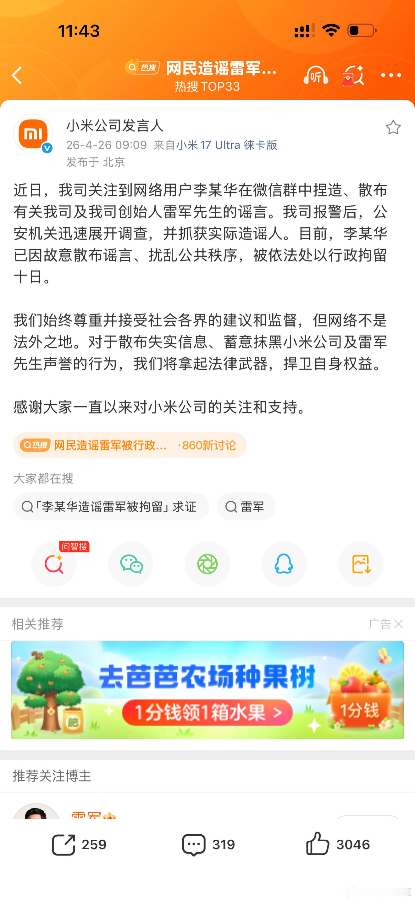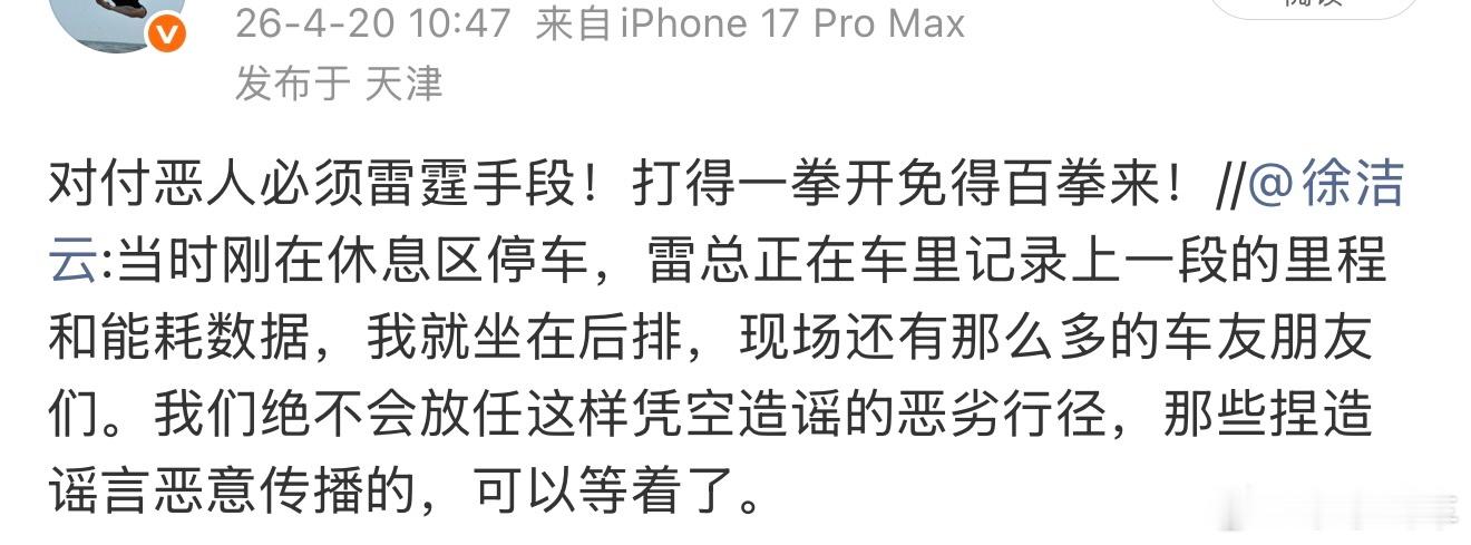 小李飞车 最近两件事我特别关注!一是造谣雷总被围堵维权(实际是人气旺被围观)的已经被抓了!我认为这事办的妙!我一向支持小米应该雷霆手段!徐洁云这事办的还是很硬的,六天时间进去了!二十尚界法务部说展车被破坏,刷到挺多掰开的,如果蓄意破坏我也特别支持打击,这个建议尚界也把破坏展车的人找到送进去!谣言不攻自破!