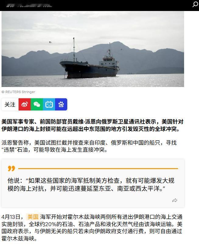 局势已经非常危险,美国军事专家前五角大楼官员派恩警告称,如果美国继续对伊朗进行海上封锁,可能引发美国与中国、俄罗斯和印度的直接冲突。