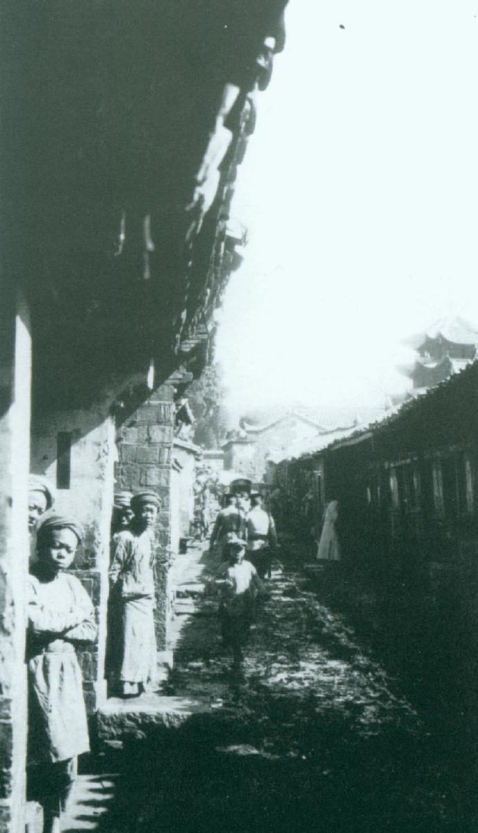 民初,西南某老城街巷,两侧是砖木结构的民居,屋檐挑出形成阴凉,路面是泥泞不平的土路,远处的楼阁式建筑,是城镇里的地标建筑,也说明这是有一定规模的城镇,而非偏远村落。