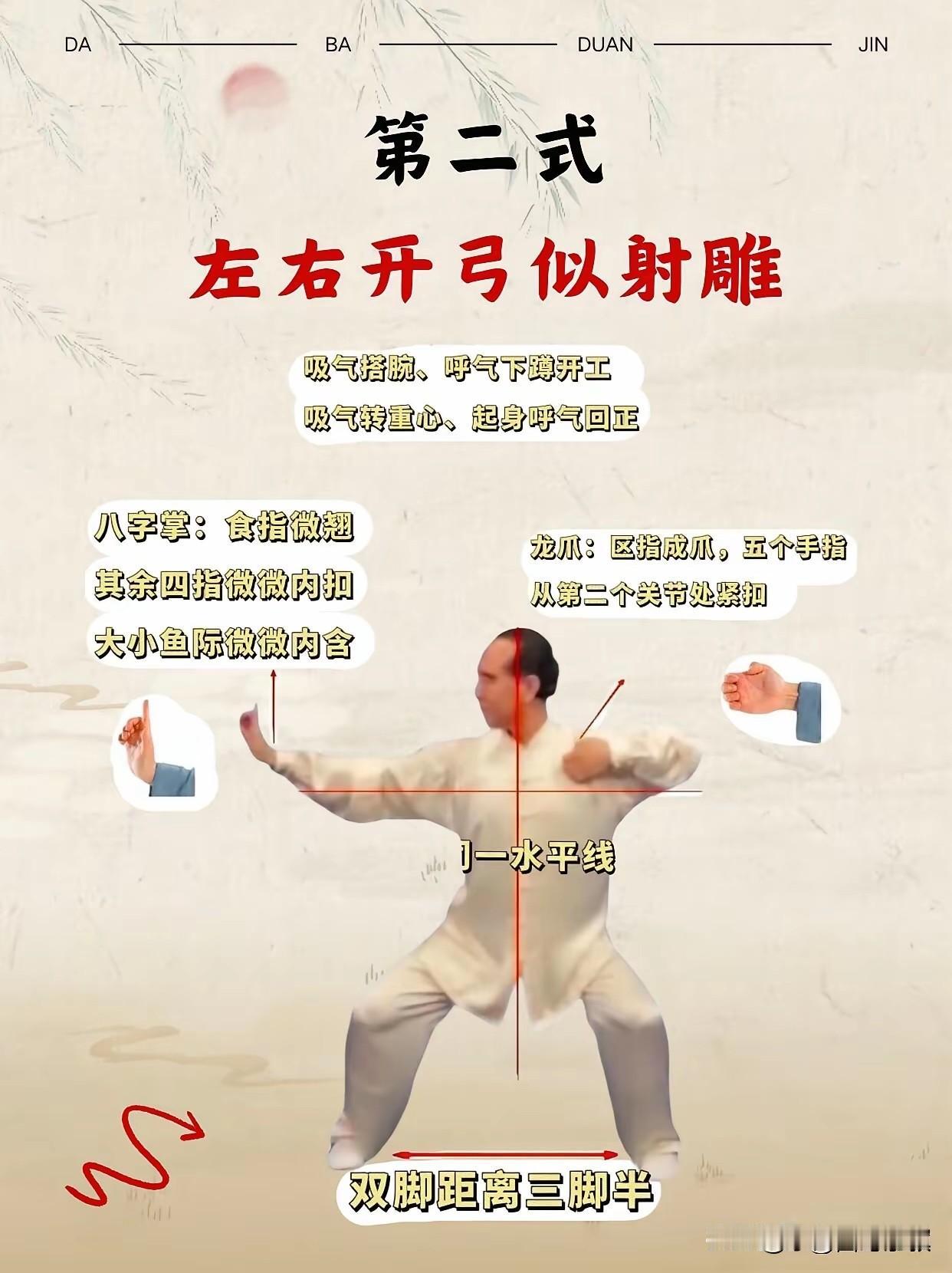 练“左右开弓似射雕”时,我以前蹲得太浅,双脚也没站到三脚半宽,结果练完膝盖酸得不行。照着图里的要领调整后,马步蹲稳,八字掌和龙爪的姿势做标准,开弓时肩膀下沉不耸肩,呼吸跟着动作走,练完腰背反而松快了。“调理脾胃须单举”时,以前总把胳膊硬往上抬,忽略了“相反拉力”,现在上举的手用掌根发力,下撑的手指尖朝前,同时收腹提肛,才感觉到脾胃区有微微的拉伸感。