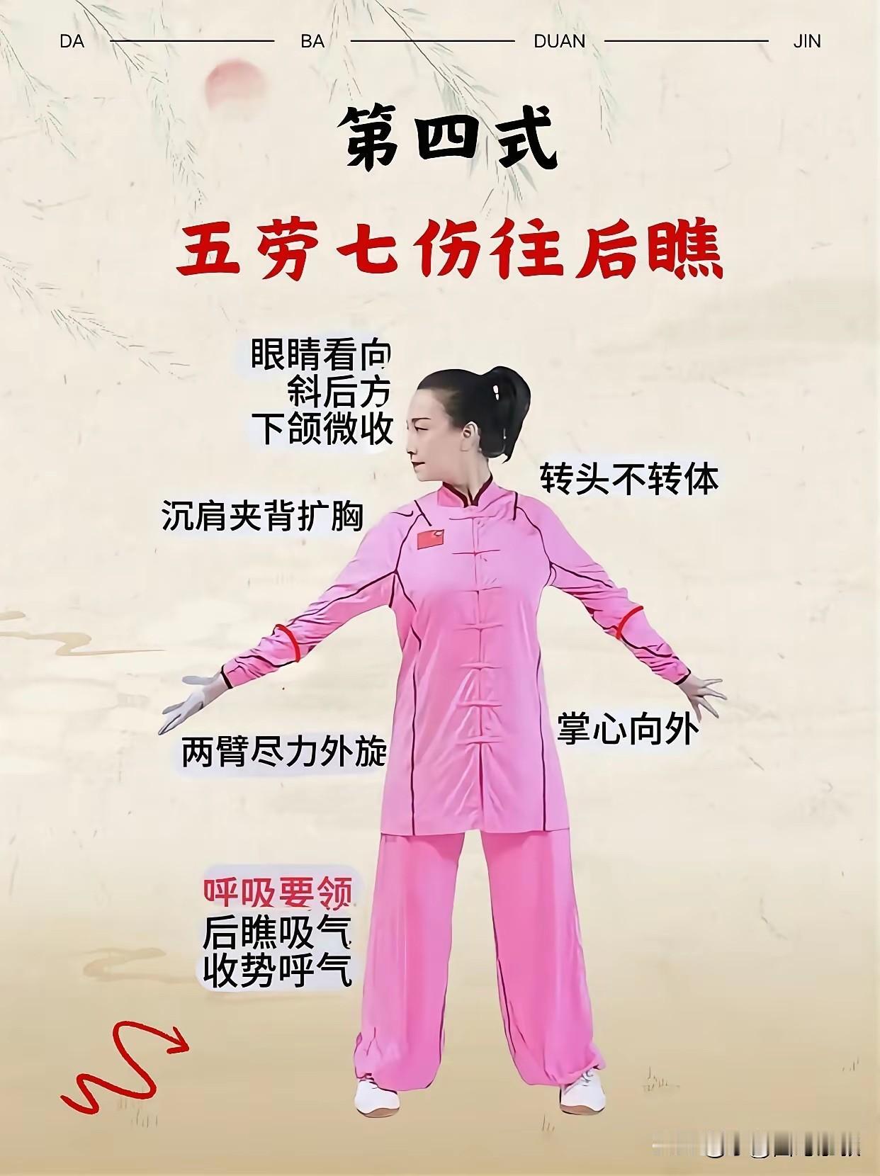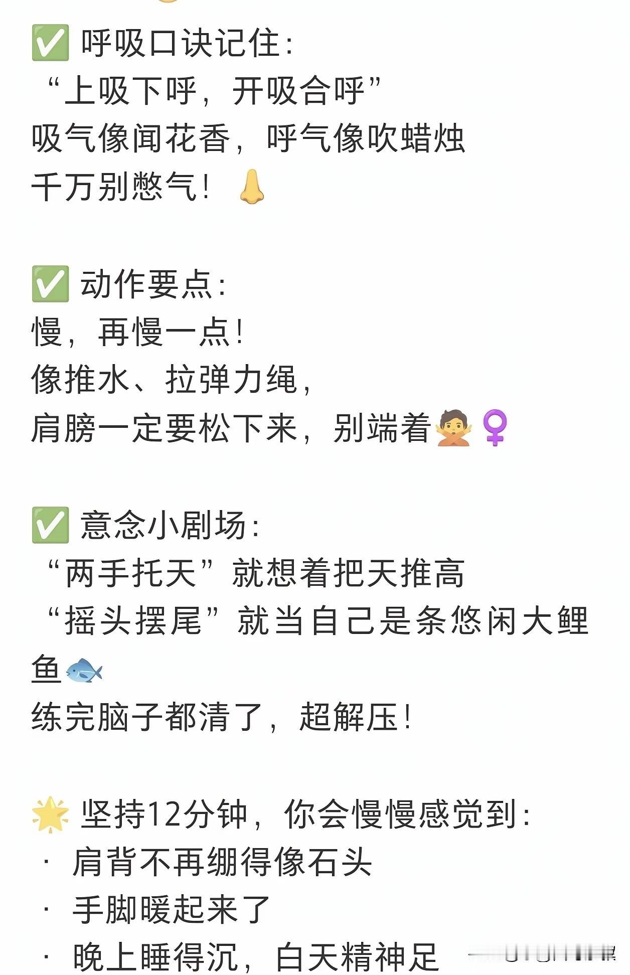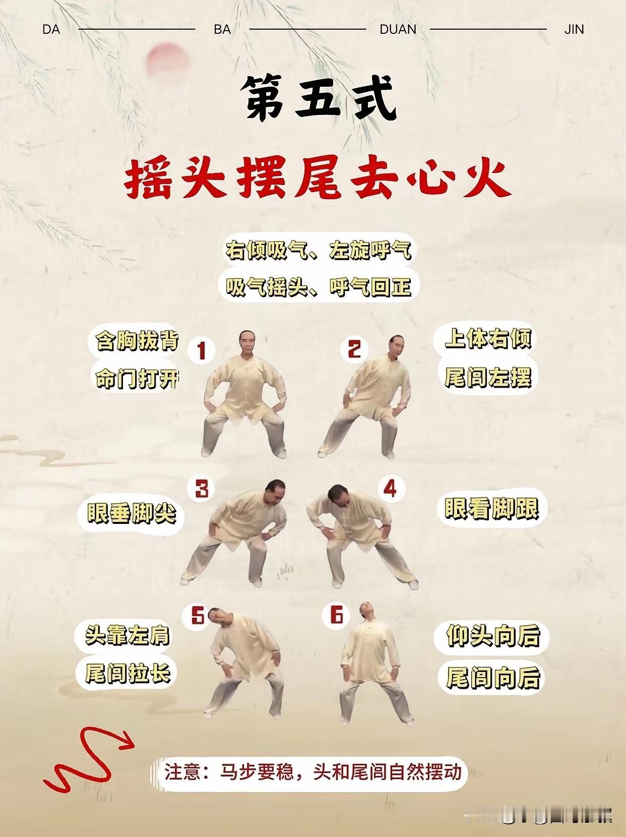 “五劳七伤往后瞧”最容易犯的错就是转体,现在记住“转头不转体”,沉肩夹背扩胸,两臂外旋,后瞧时吸气,整个人的肩颈僵硬感都缓解了。“摇头摆尾去心火”的马步一定要稳,头和尾闾跟着动作自然摆动,以前我总把腰拧得很僵,现在跟着呼吸慢慢做,反而能感觉到腰背在慢慢舒展。