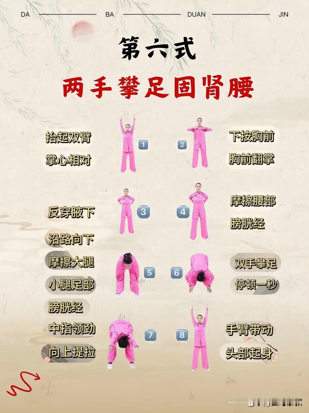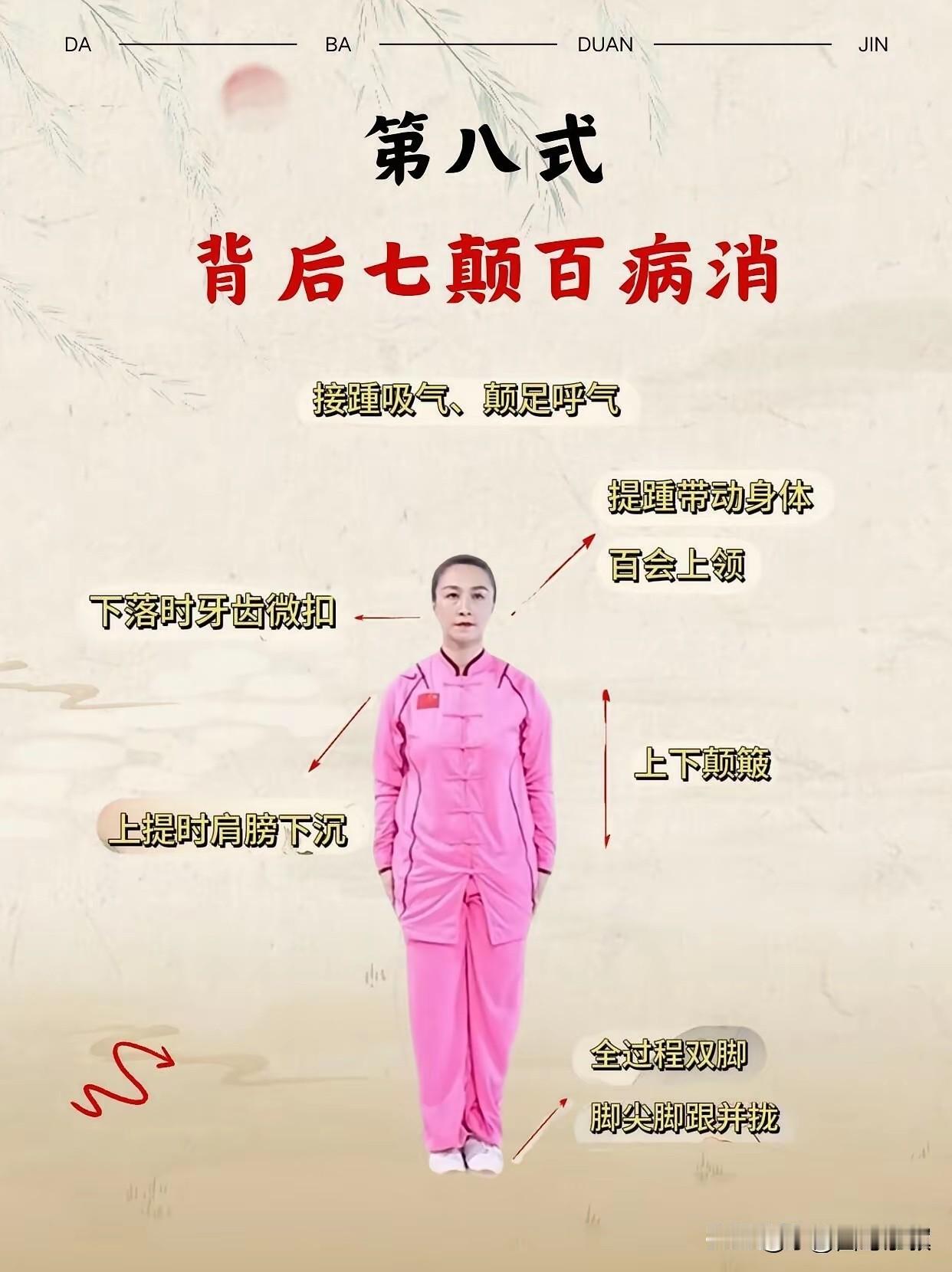 “两手攀足固肾腰”以前我弯腰全靠脖子使劲,现在跟着步骤,从抬手、翻掌到下按,再到摩擦腰部、攀足停顿,每一步都不着急,才知道这个动作练的是整条膀胱经。“攒拳怒目增气力”里,握固的姿势、出拳时的旋转细节,还有怒目出拳的要领,以前全没注意,现在照着练,手臂发力感一下就出来了。最后一式“背后七颠百病消”,以前颠脚时肩膀总往上耸,现在记住“上提时肩下沉,下落时牙齿微扣”,颠完感觉整个人都轻了。