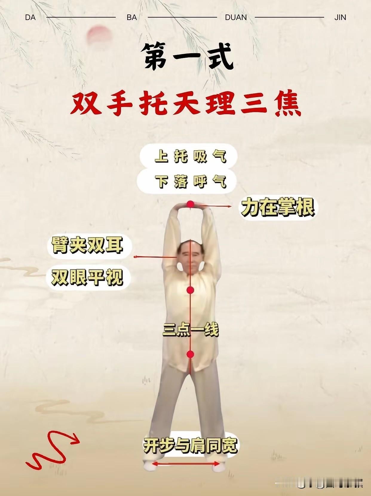 最开始我连手型都没搞懂,全是瞎比划,后来才知道不同招式有专属手型:托天用自然掌、射雕用八字掌、出拳用握固,每一种都有讲究。比如“双手托天理三焦”,以前我总爱耸肩,现在才知道要臂夹双耳、力在掌根,上托吸气、下落呼气,身体从头到脚要保持一条直线,这样才是真正拉开了三焦经。
