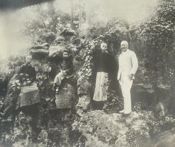 20世纪20年代初,紫禁城御花园里,太湖石假山上,溥仪与英文老师庄士敦及亲弟弟溥杰与润麒的合影。
