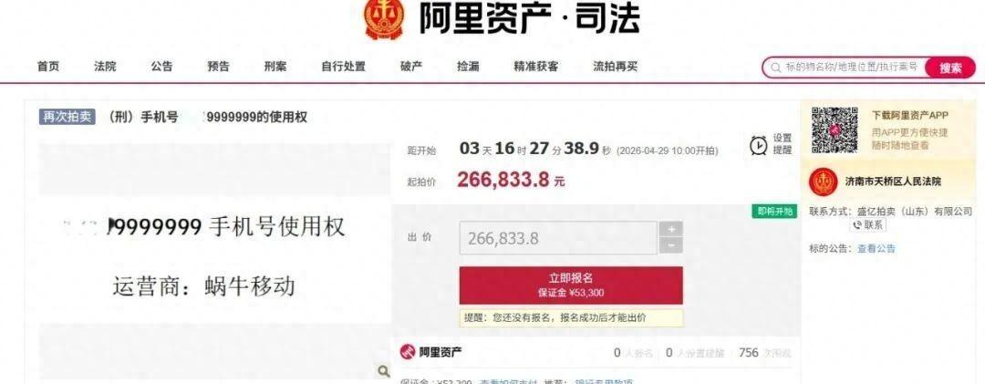 法院也很实在。第一次没人要,直接降到26万,腰斩近半。这比那些死咬着高价不松口的处置方强多了。市场认不认,数据说话——2026年2到4月,至少4个百万级靓号流拍。