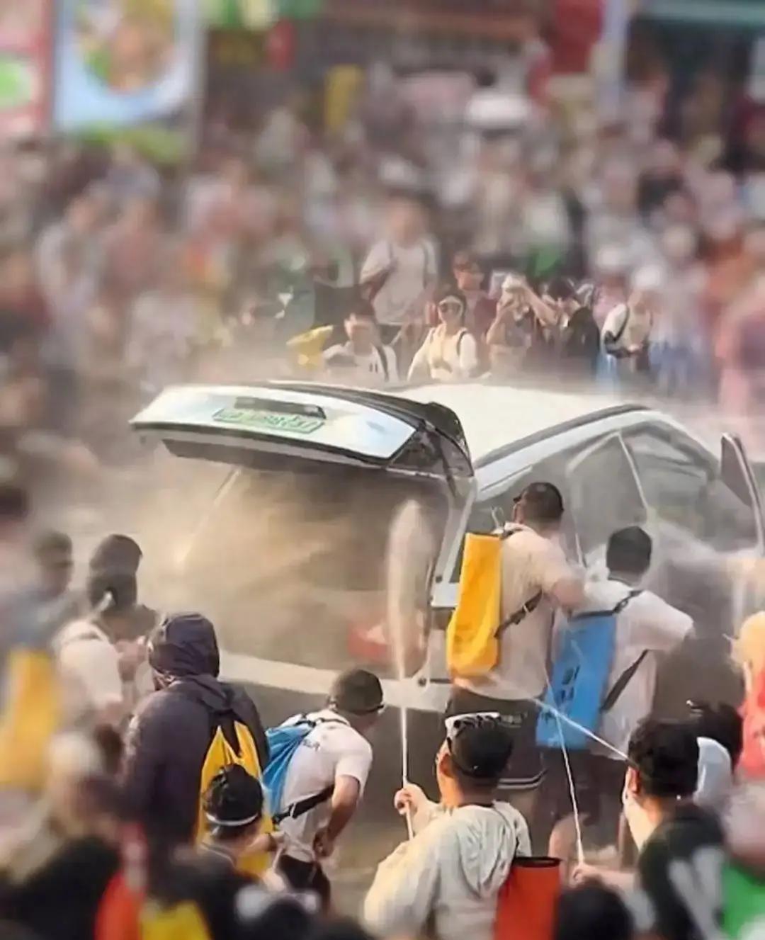 上百号人围上来,有人拉车门,有人开后备箱,水枪对着驾驶台猛滋。