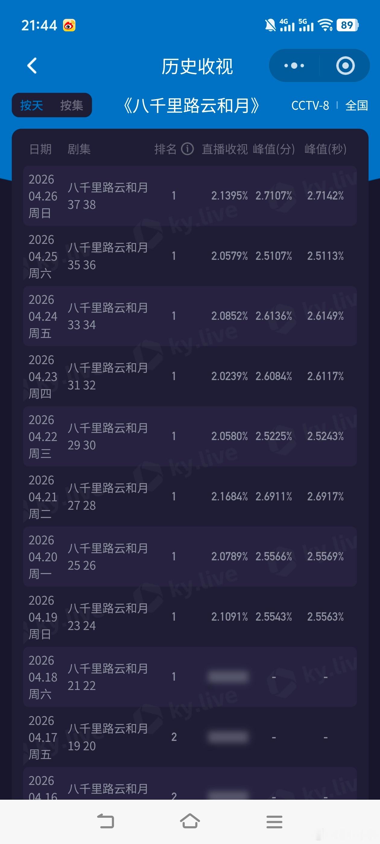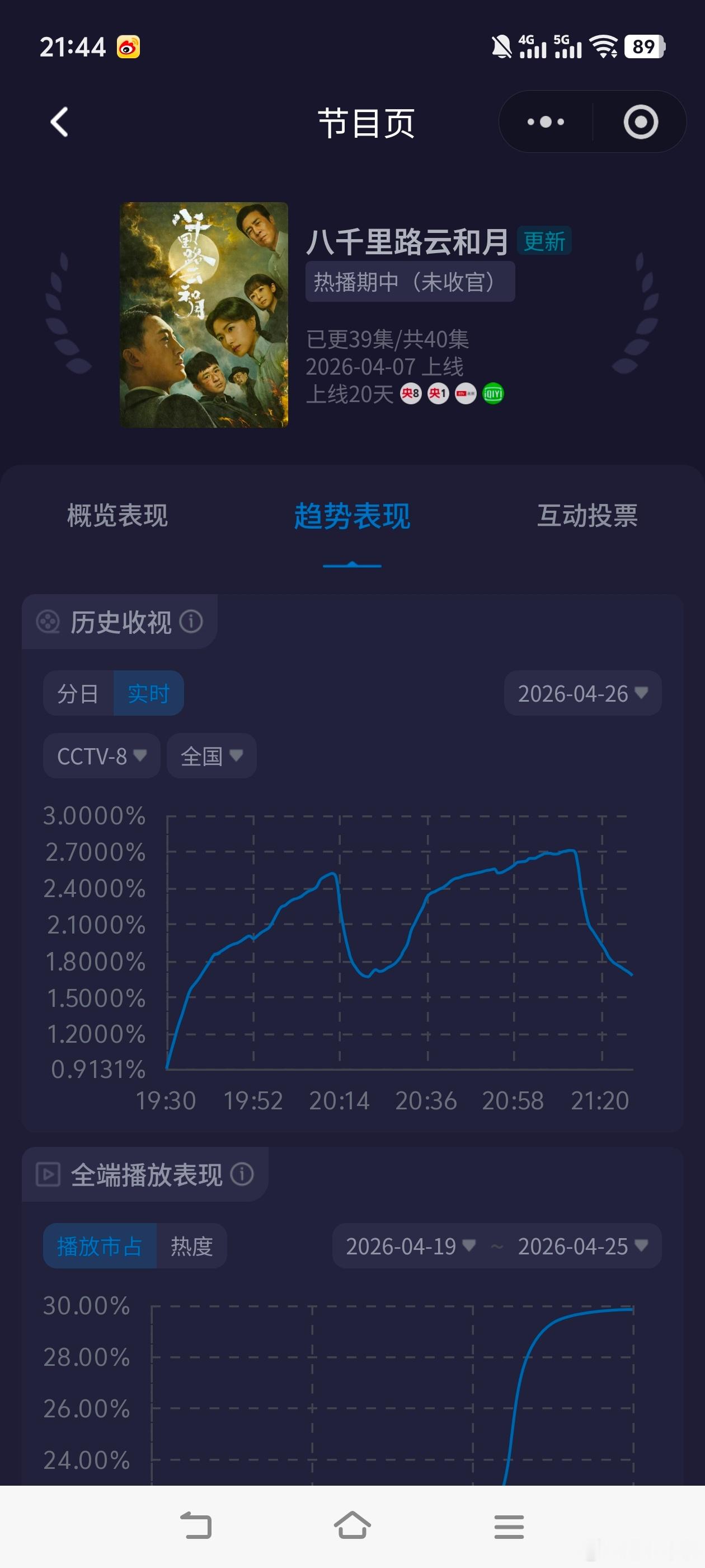 八千里路云和月 周日酷云峰值2.7142新高!明晚大结局还有机会破3吗?