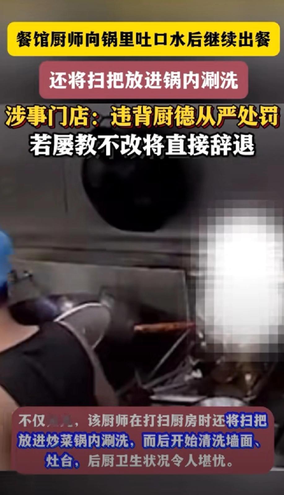还有人质疑,就算是油溅到嘴里有本能反应,也不该往锅里吐口水,更不能用扫把洗锅,门店还能给这样的厨师“改过机会”,谁敢来店里吃饭。