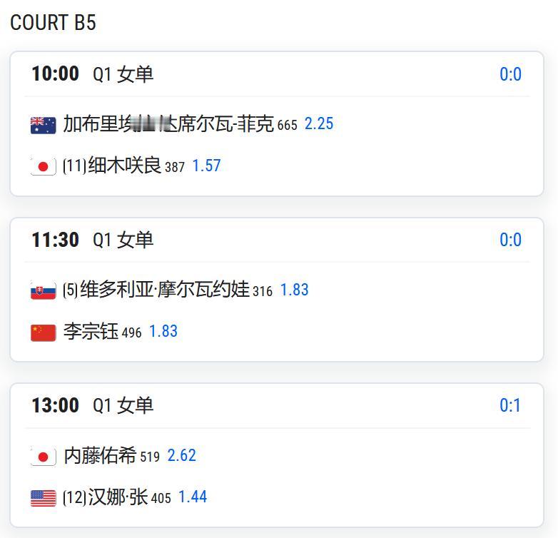 李宗钰将对阵5号种子摩尔瓦约娃;