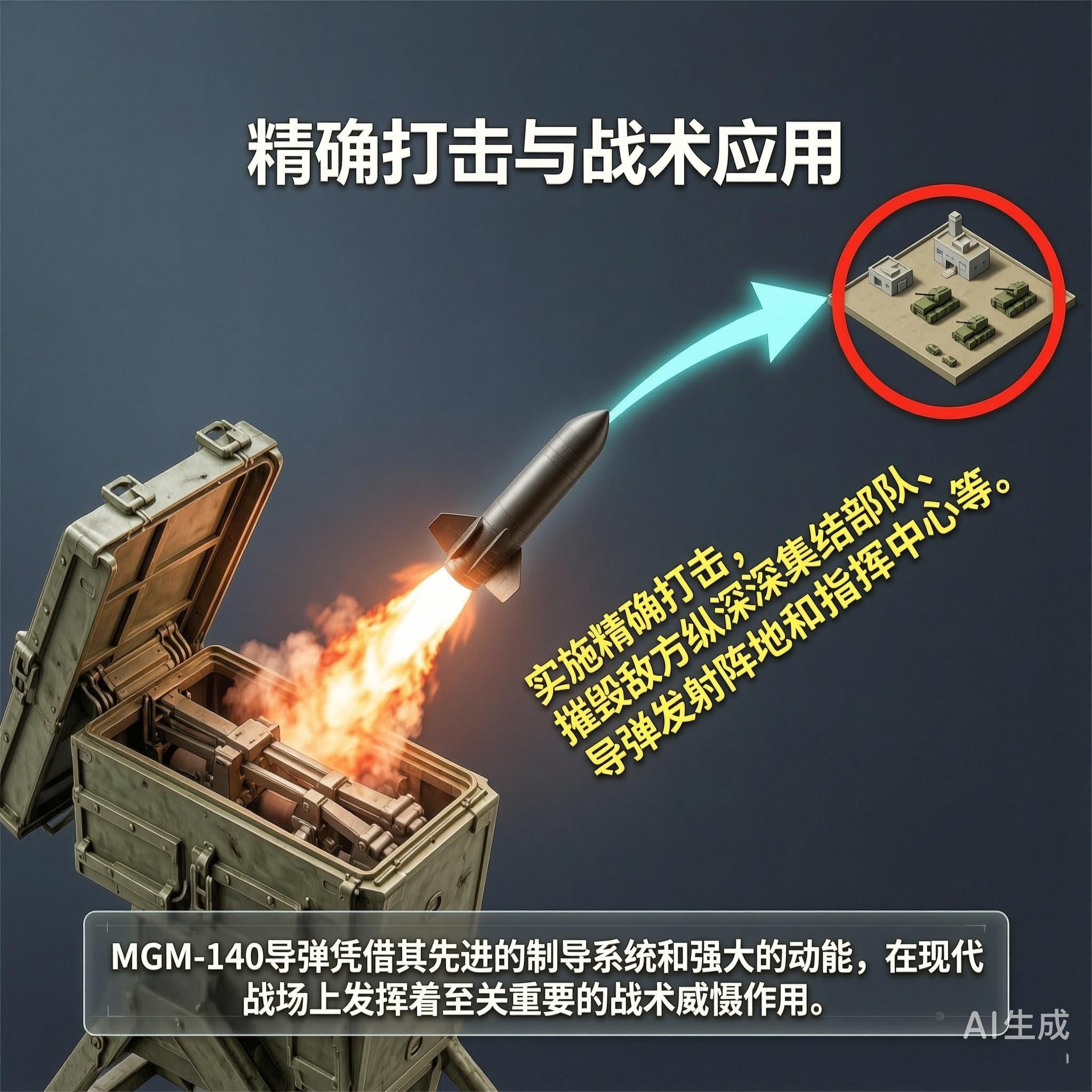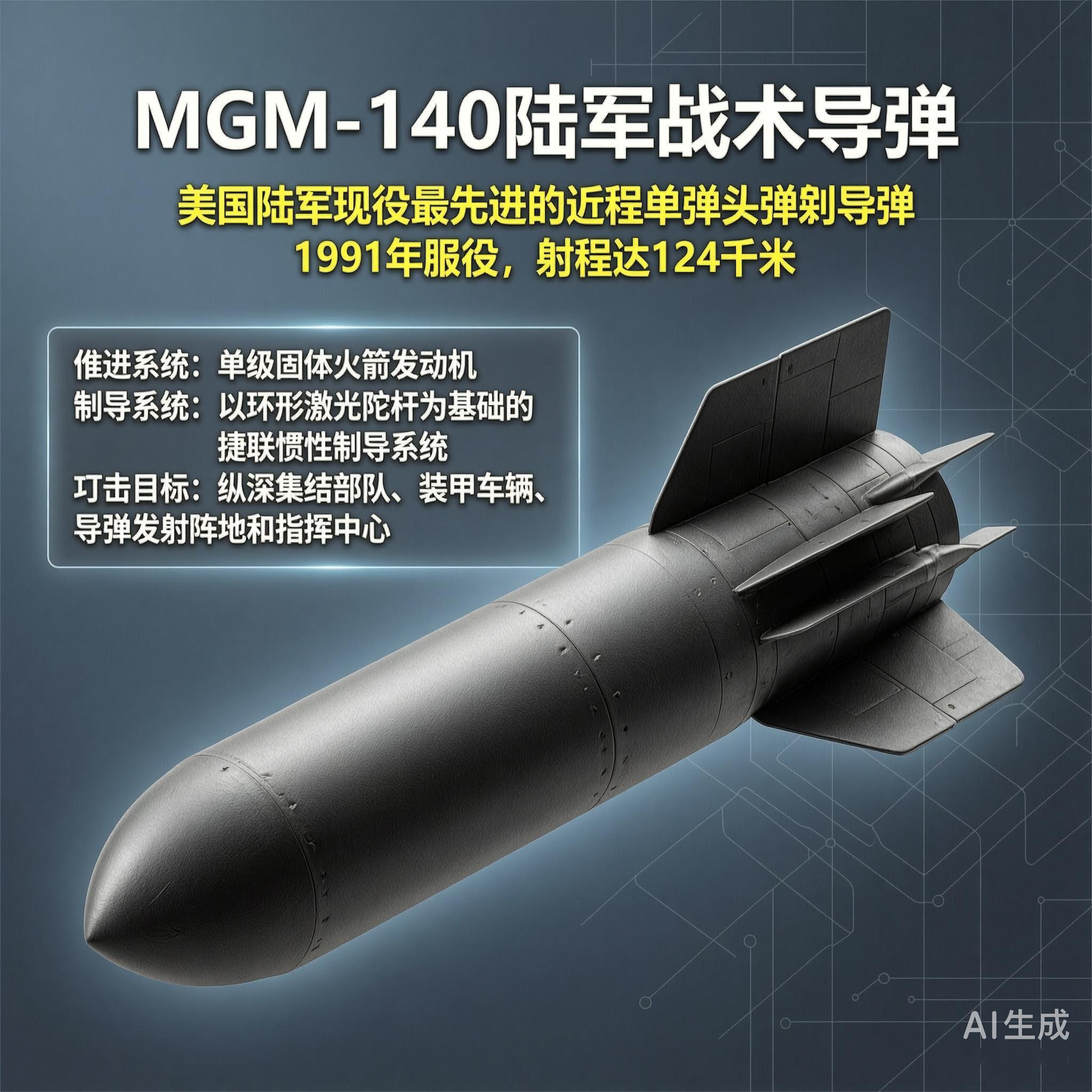 MGM-140陆军战术导弹是美国陆军现役最先进的近程、单弹头弹道导弹,1991年开始服役,可用于打击纵深集结部队、装甲车辆、导弹发射阵地和指挥中心等。