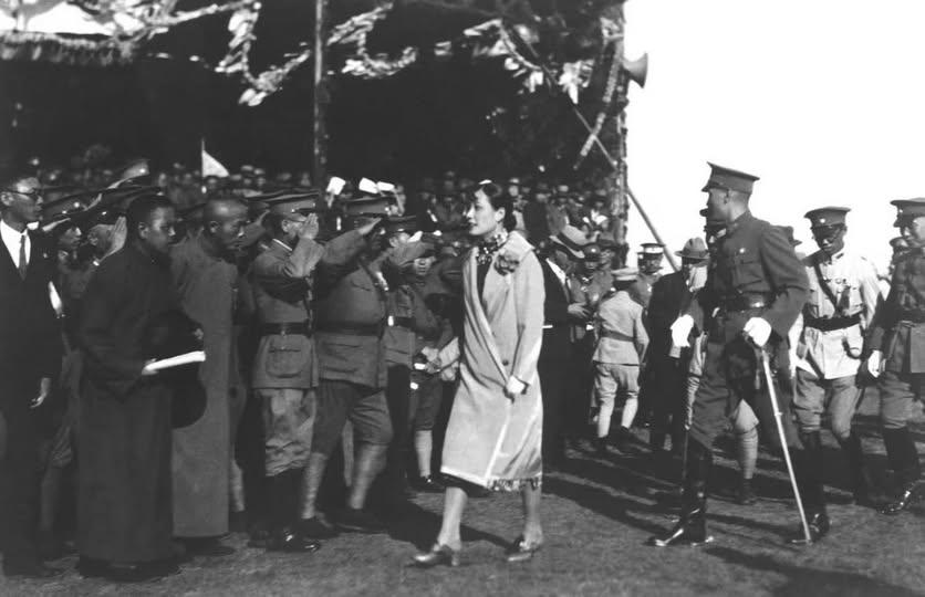 这张照片中宋美龄,身着长款大衣,搭配高跟鞋,颈间佩戴精致项链,仪态从容,步伐优雅,这是她婚后以蒋夫人身份公开亮相的早期形象;右侧的蒋介石,一身笔挺军装,拄着手杖,姿态威严,正陪同宋美龄检阅部队。