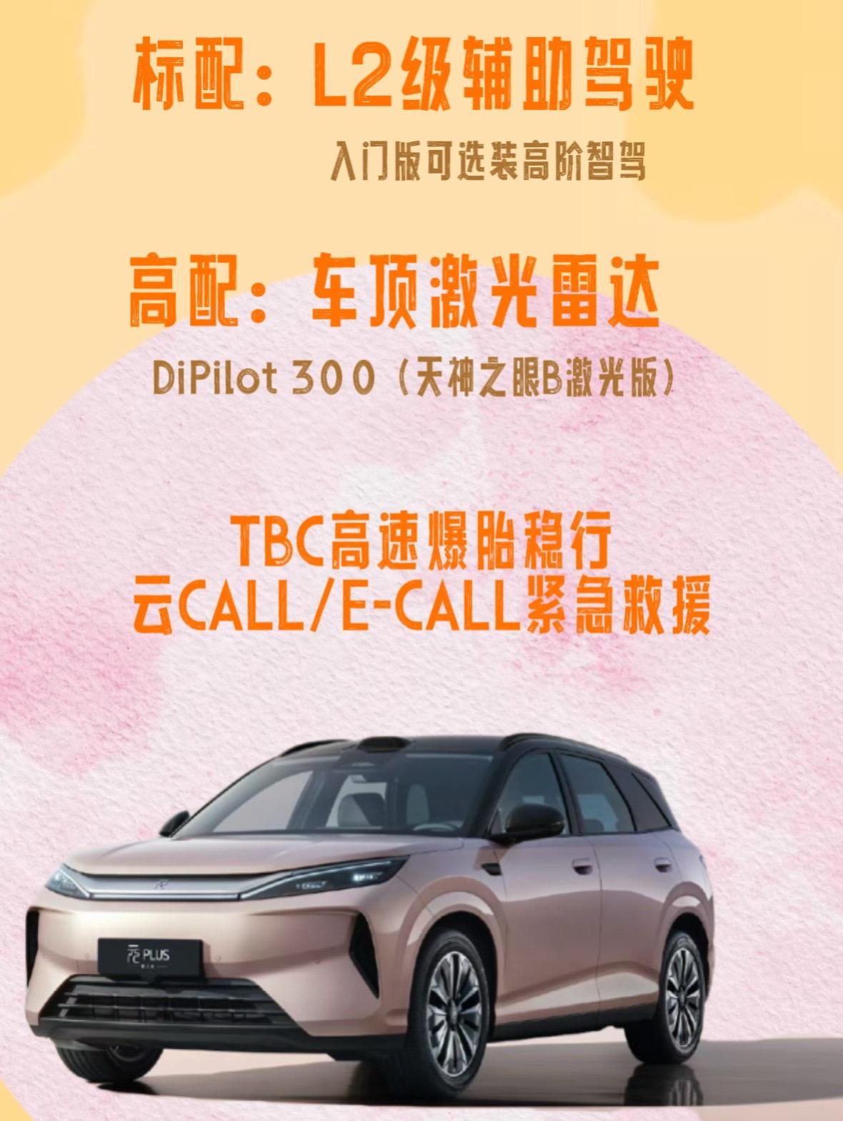 标配:L2级辅助驾驶,入门版可选装高阶智驾;高配车顶激光雷达,DiPilot 300(天神之眼B激光版),支持高速领航、自动泊车(成功率96%)、代客泊车。