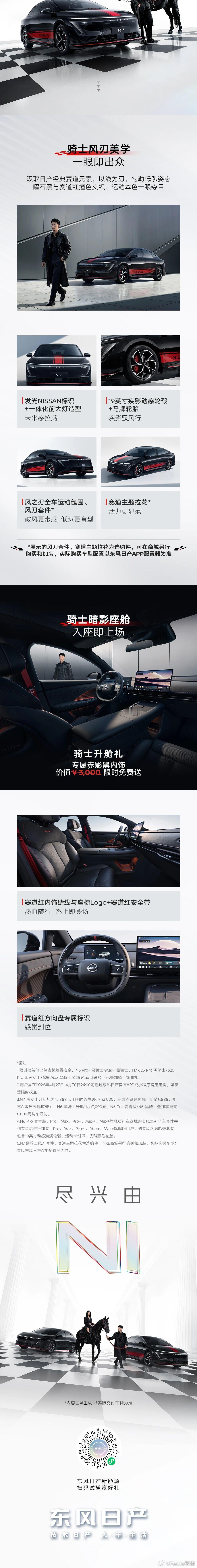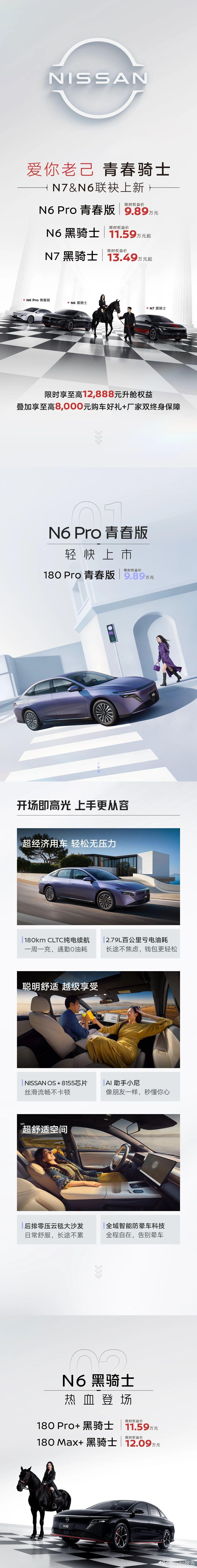 N6 Pro青春版主打高性价比家用,标配21.1度大电池,纯电续航180公里,亏电油耗表现优异,日常通勤、长途出行兼顾省钱实用。依托日产多年造车积淀与严苛品控,搭配三电终身质保、自燃全额赔付政策,售后体系完善。车辆空间宽敞、得房率出色,搭载智能车机与舒适座椅,以越级配置重新定义入门家用出行标准。N6、N7骑士版融入GT-R赛道基因,采用骑士锋刃美学设计,标配运动包围、动感轮毂、专属内饰与特色车色,外观气场更强。其中N6黑骑士版在现款车型基础上升级运动套件,N7骑士版提供双风格选择,兼顾家用实用性与驾驶运动氛围。作为标杆纯电家轿,日产N7口碑表现亮眼,坐拥长续航版本,底盘经过专业调校,搭配全域防晕车技术与宽适空间。智能层面搭载高阶芯片、双大模型智舱与端到端智驾辅助系统,娱乐、交互、行车辅助全面在线。同时依托成熟纯电技术与高刚性车身,搭配多重主动安全配置,出行防护扎实可靠。此次三款新车联袂登场,N6 Pro青春版主打亲民实用,双骑士版满足个性化运动需求,全面兼顾家用舒适、经济省心与个性驾控,进一步强化东风日产在家用新能源市场的产品竞争力。N7N6双骑士热血登场9万买合资品质插混N6东风日产爱你老己青春骑士东风日产N7东风日产N6