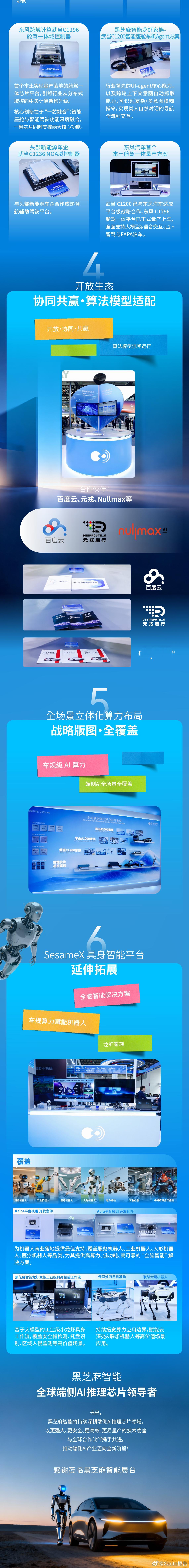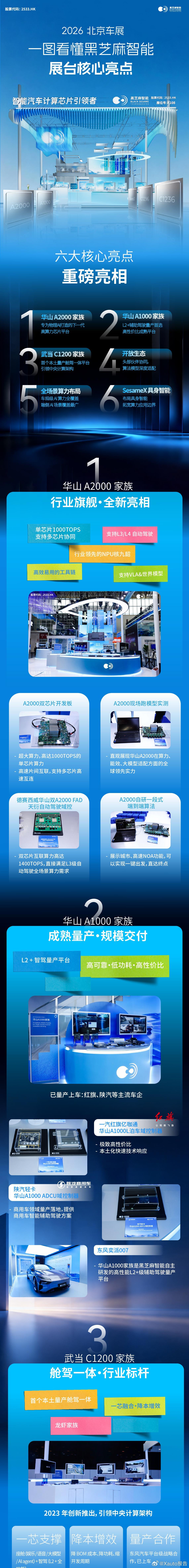 一图看懂A2000全新家族芯片产品亮点。黑芝麻智能亮相北京车展,展出华山A2000全系列高算力智驾芯片,落地端侧大模型与端到端智驾。发布L3自动驾驶平台,达成L4出行生态合作,布局舱驾一体与具身智能,完善全域车载算力布局。黑芝麻智能华山A2000家族物理AI下一代高算力芯片平台2026北京车展