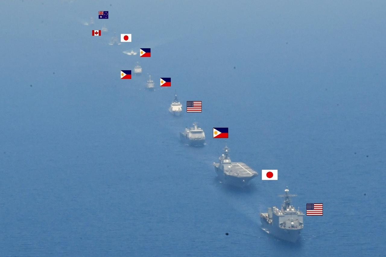 4月27日,美国海军太平洋舰队第7舰队,对于美日菲澳加举行的所谓“肩并肩”演习表示:“盟友与合作伙伴海军!在演习期间,5个国家的11艘舰船在南海共同航行,展示了维护印太地区海上安全的集体承诺。”这一次“肩并肩”演习,参演的舰艇包括,五个国家,包括了日本海上自卫队的伊势号直升机母舰、雷号驱逐舰和下北号登陆舰,美国海军的阿什兰号船坞登陆舰,美国海岸警卫队米吉特号巡逻舰,澳大利亚海军图文巴号护卫舰,菲律宾海军出动了丹辘号登陆舰、米格尔·马尔瓦尔号护卫舰、安东尼奥·卢纳号护卫舰,加拿大海军夏洛特敦号护卫舰。
