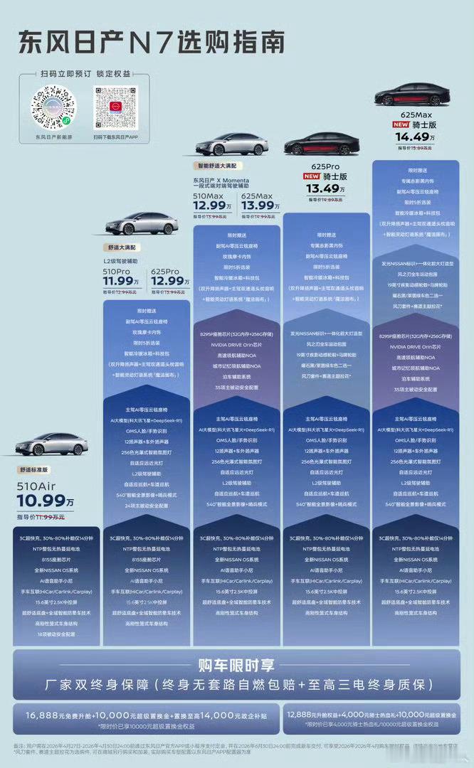 东风日产N7 新增车型N7骑士版限时售价:13.49万元起核心配置:625km续航、AI零压云毯座椅、高通8295P芯片、Momenta端到端智驾(支持高速NOA)、发光NISSAN标识