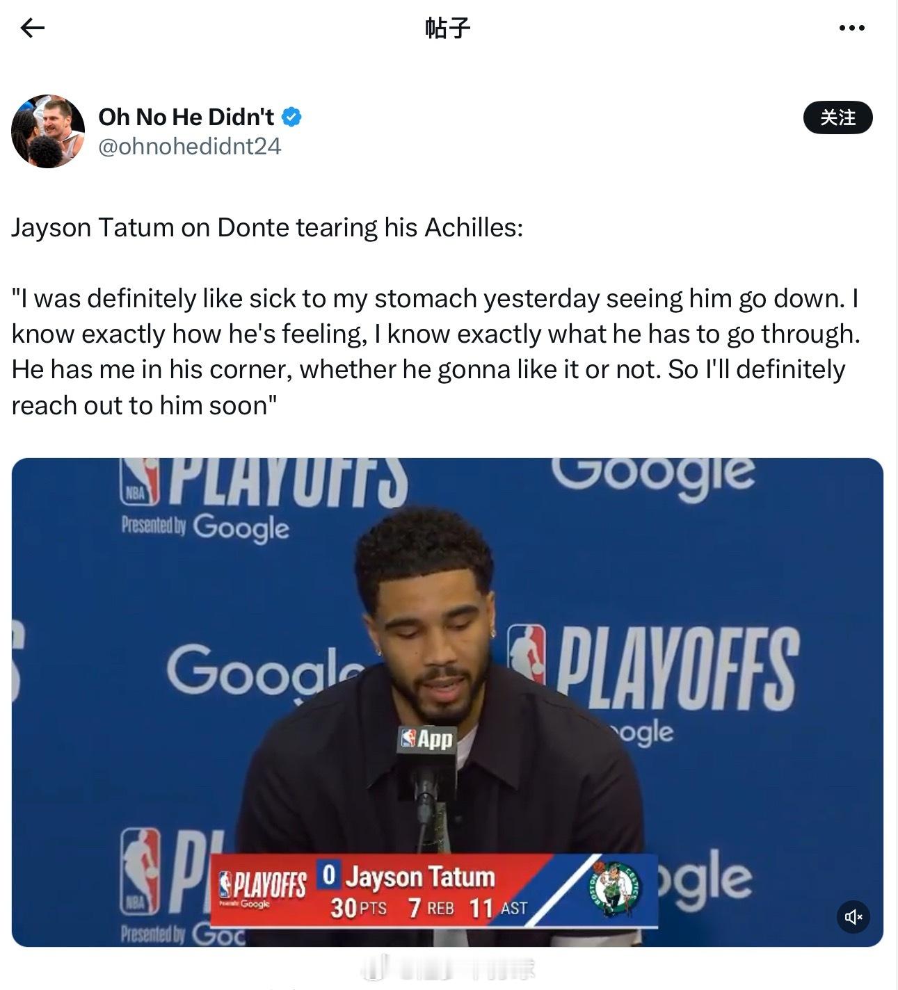 今天赛后,塔图姆谈及唐特(迪温琴佐)跟腱撕裂受伤一事