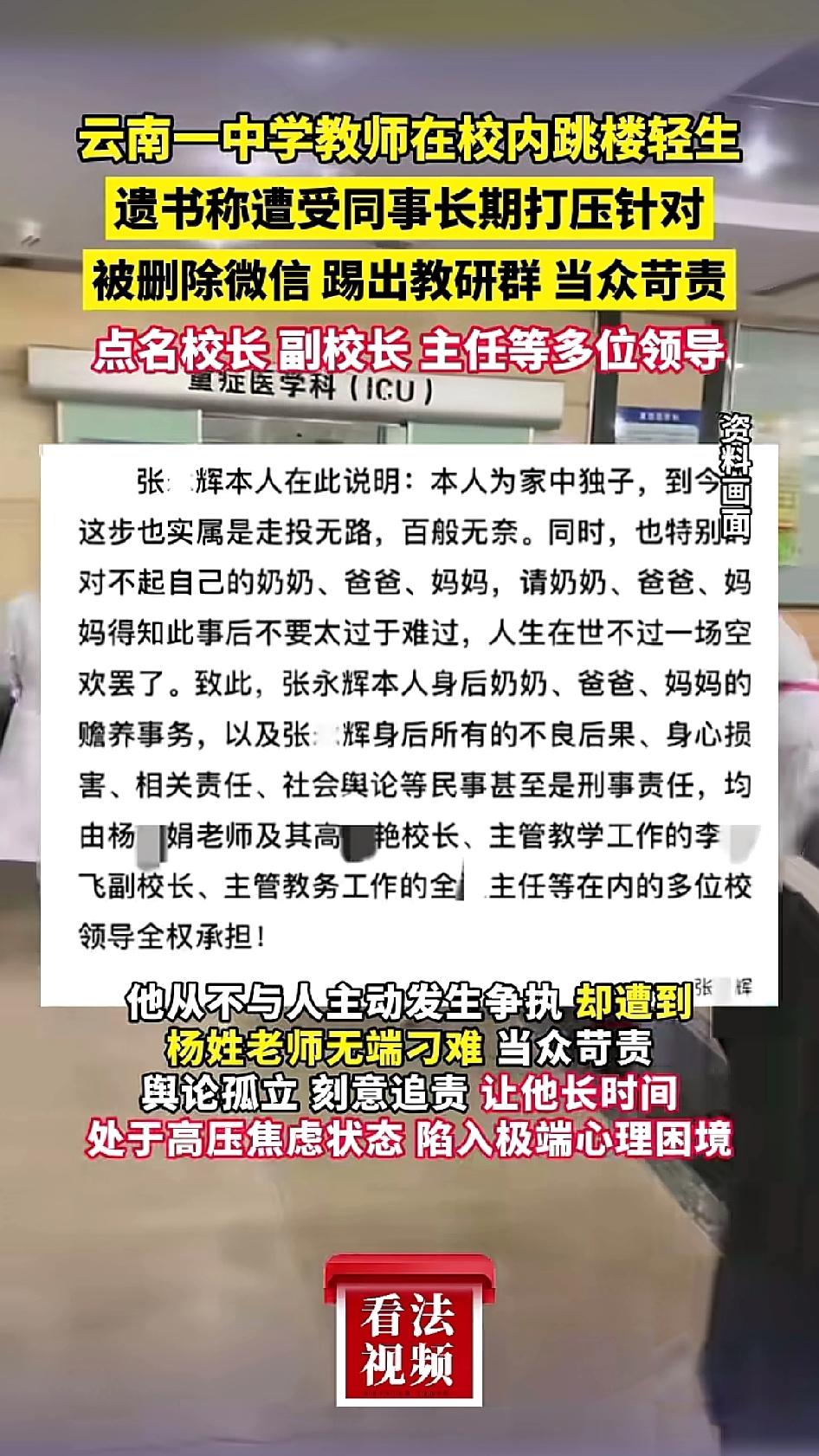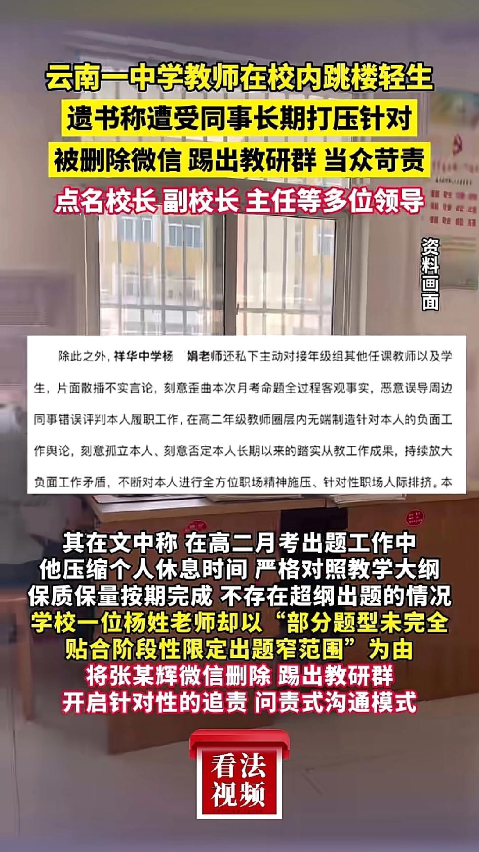 云南姚安一中,一位高三男教师从教学楼坠下。幸运的是,命保住了,人还在康复中。网传他留下遗书,说自己长期被同事和校领导针对、打压,精神几近崩溃,最终用这种方式“证明自己”。