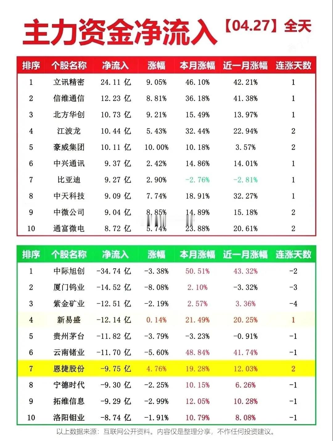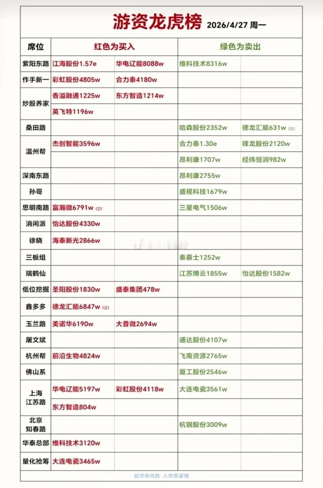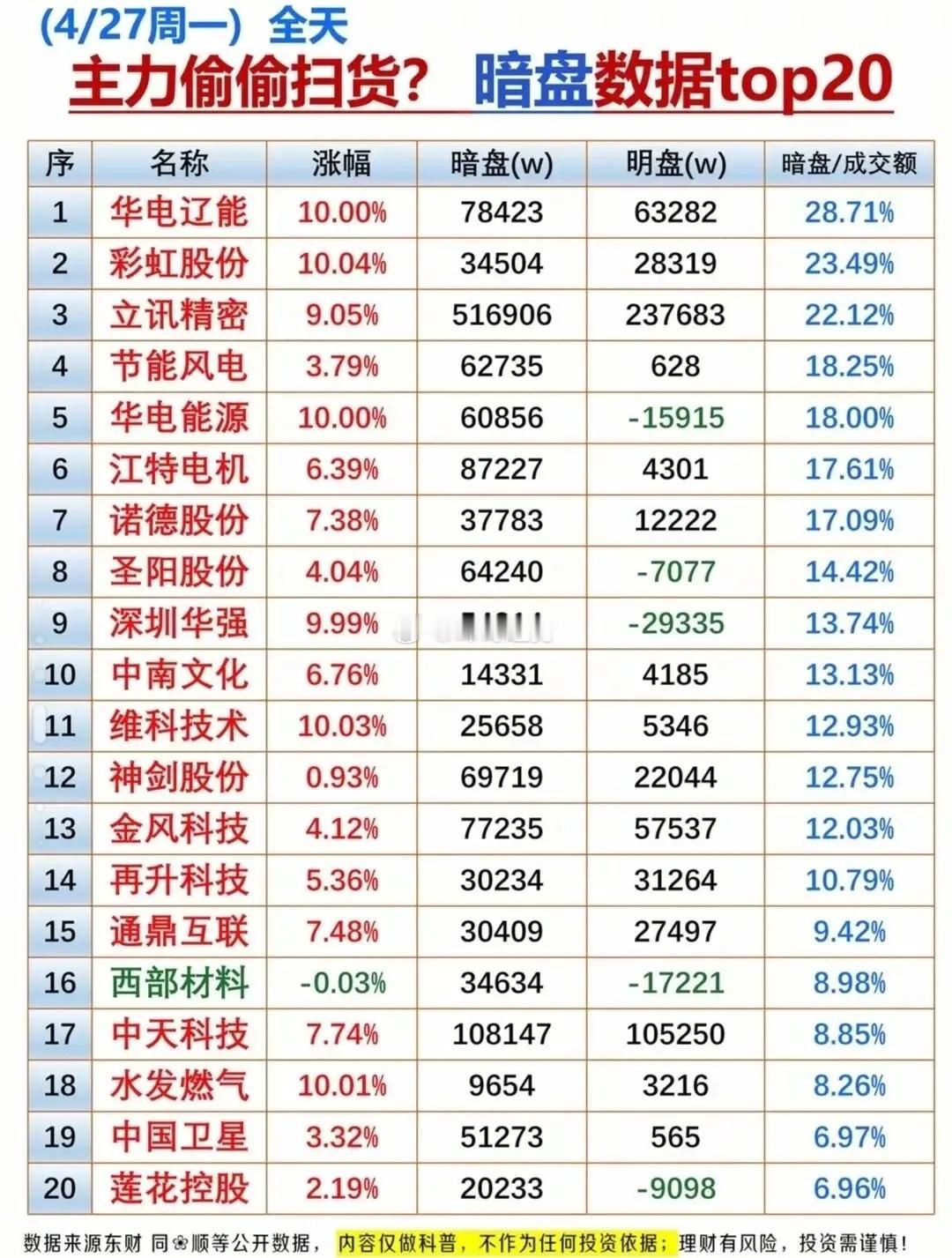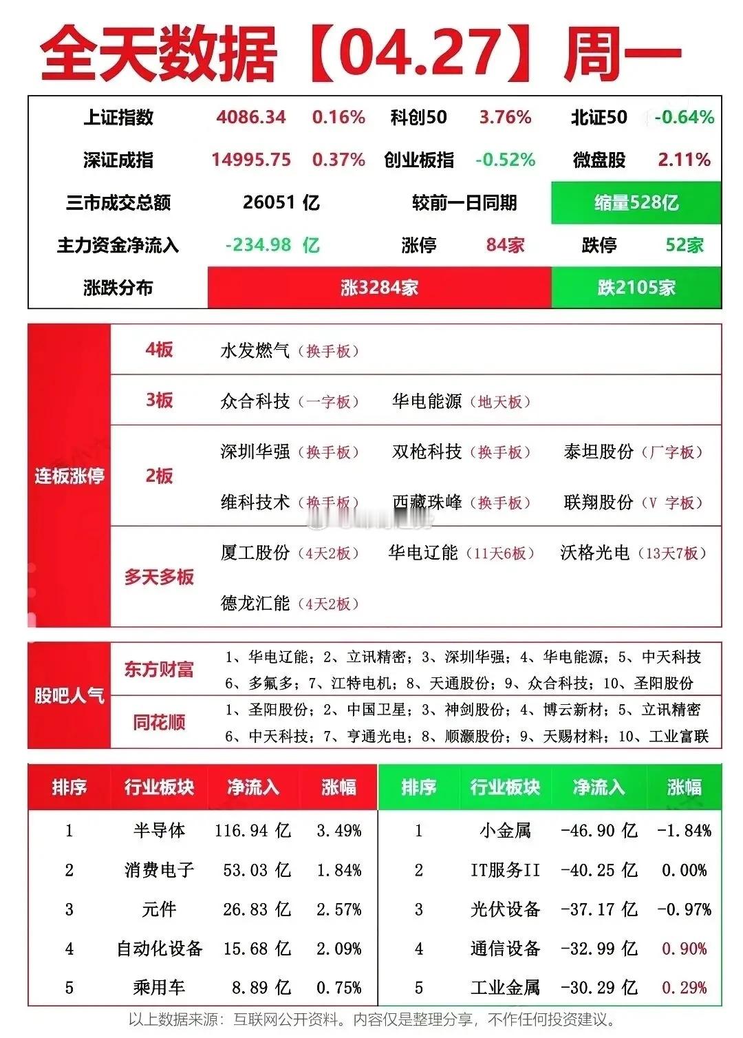 炸了!科创50暴涨3.76%,2.6万亿成交背后,资金正在疯狂抢筹这些票!4.27周一市场复盘整理:大盘窄幅震荡,科创50领涨,两市成交26051亿,较前一日缩量528亿,主力资金小幅流出,赚钱效应一般,涨跌家数比约3:2。板块上,半导体、消费电子资金大幅流入,算力硬件、半导体、机器人、风光储能等方向领涨,华电辽能、水发燃气、深圳华强等连板个股表现活跃,立讯精密、信维通信、北方华创获主力资金大额买入,而中际旭创、厦门钨业等则遭大额抛售。尾盘抢筹榜中际旭创、源杰科技等资金承接明显,暗盘数据显示华电辽能、立讯精密等个股资金暗流涌动,多家知名游资现身龙虎榜,华电辽能、彩虹股份等获席位青睐。整体来看,市场资金聚焦科技主线,半导体、消费电子延续强势,短线情绪分化,高位连板股与低位首板并存,操作上仍需聚焦主线龙头,控制仓位,谨慎追高。今日看盘a股股票投资
